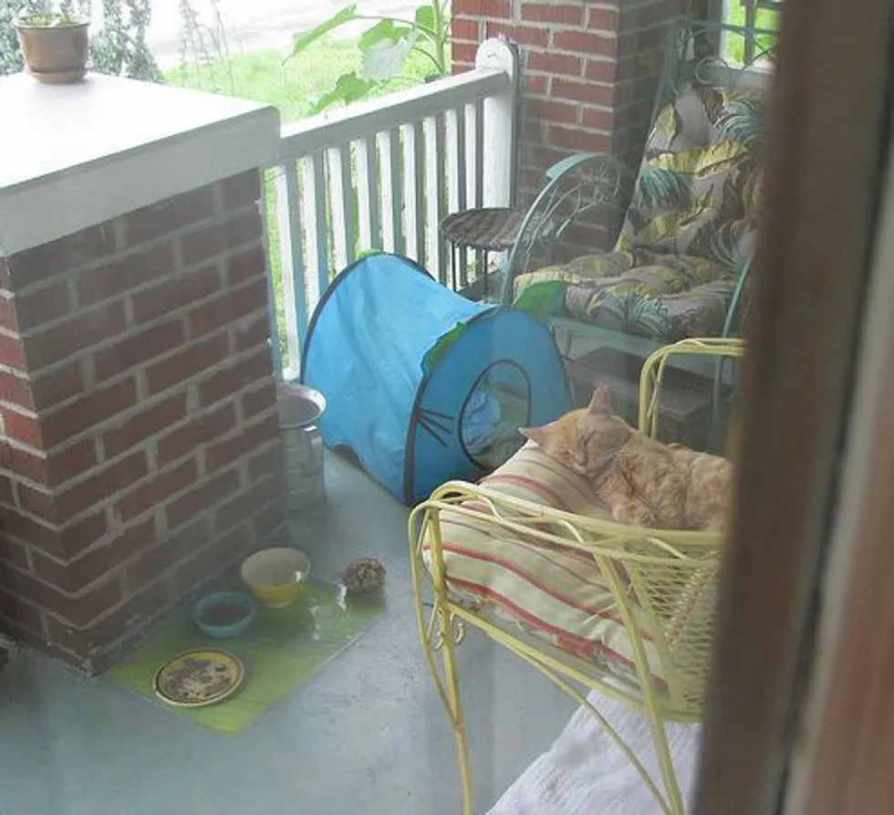 The front porch is his kingdom. He has a safe warm place there.