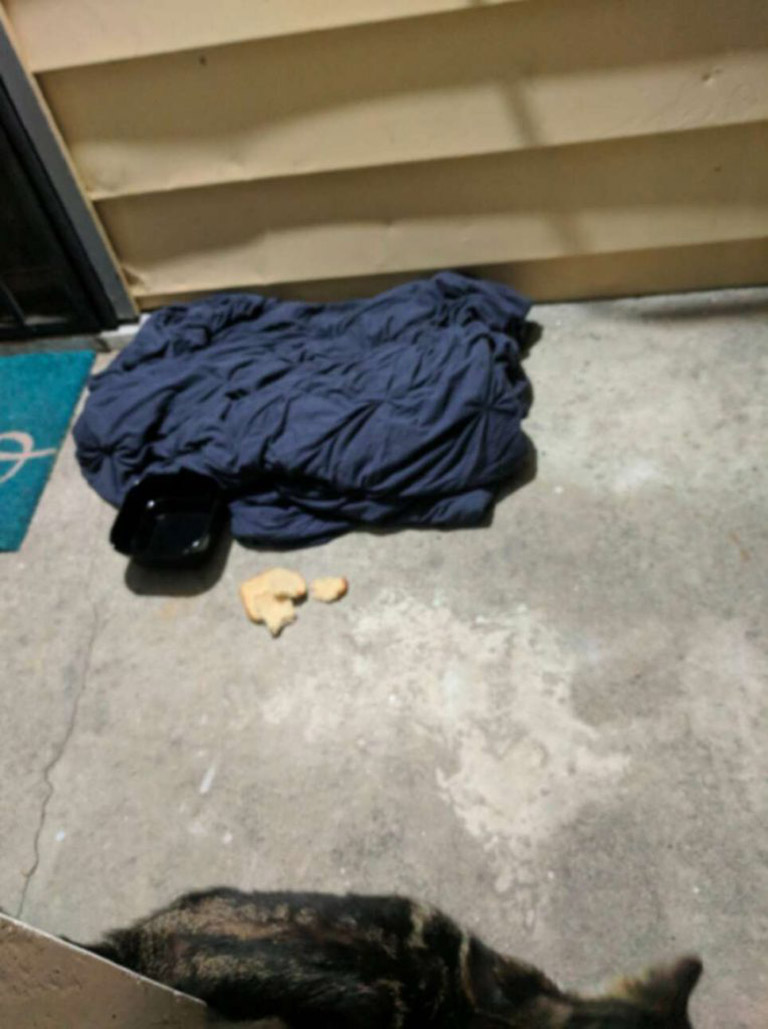 Manning had plans to go over to a friend’s house for a bit, and put out a bed and some water for the cat — later named Socks — on the front porch, secretly hoping she might stay.