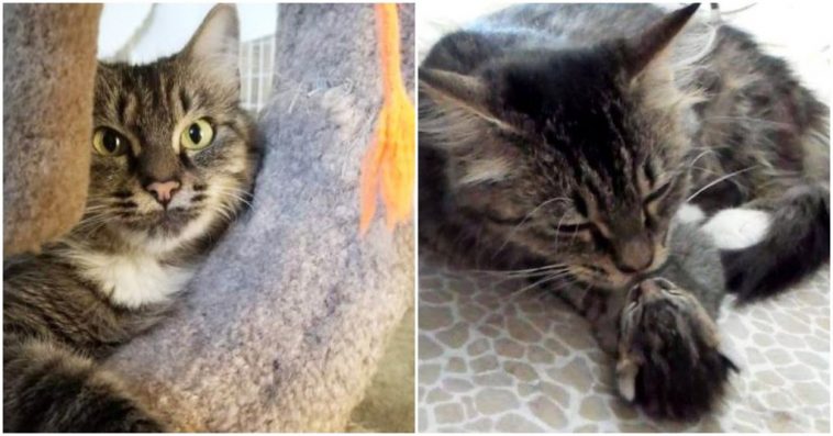 Shelby, a two-year-old cat, was discovered just before giving birth. In the early days of parenthood, one loving individual happened to see her and fed her.
