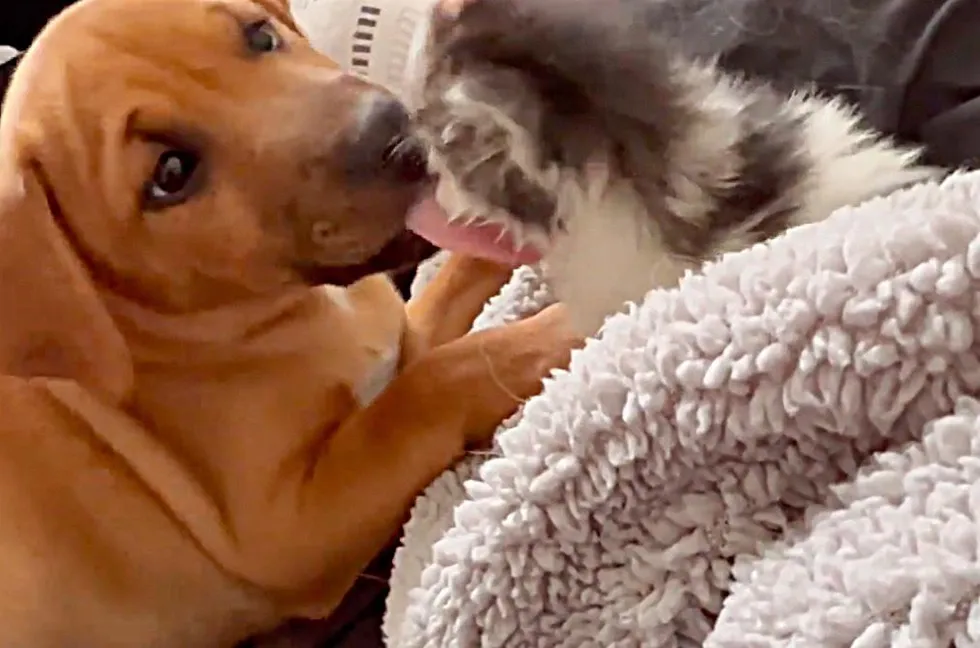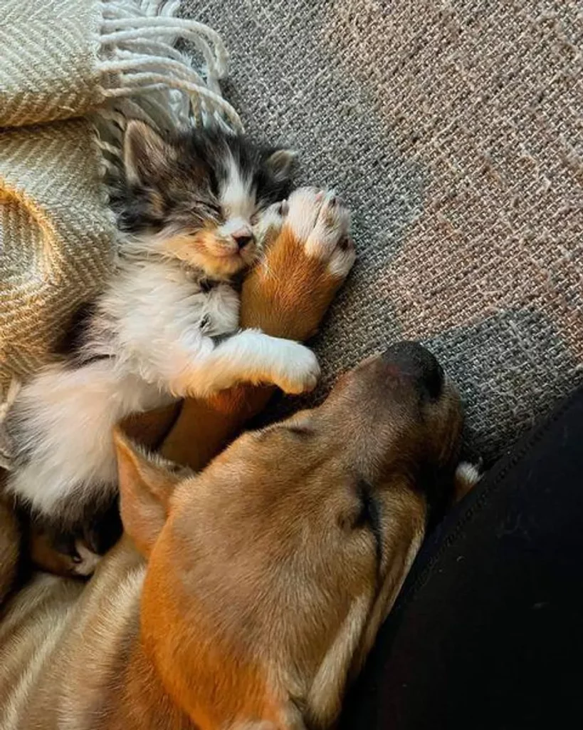 Ralfie who was much larger in size, gingerly nudged the kitten with his nose and started washing her face. Despite being at a tender age himself, Ralfie was incredibly gentle, patient, and nurturing to his feline friend.