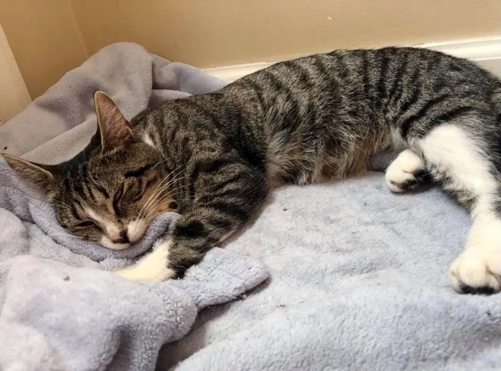 She was scared but found comfort from the towels. After the long ordeal, she could finally get some shut-eye.