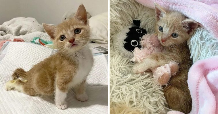 The kitten was in rough shape upon arrival—he was just skin and bones, lethargic, hungry and covered in fleas. “It was evident he had no movement in the lower half of his body, as he would drag his torso and legs across the ground to move only using his front paws,” Jessica shared with us.