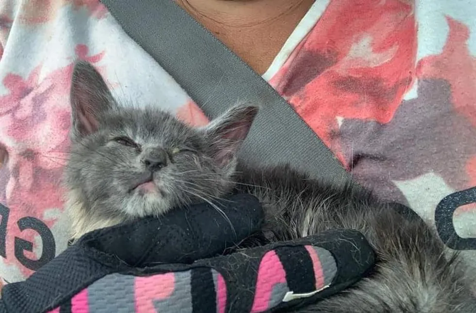 A kitten wriggled her way into the heart of a woman, who cared for her after she was rescued from a storm.