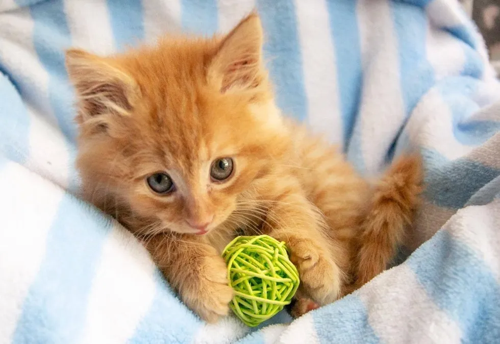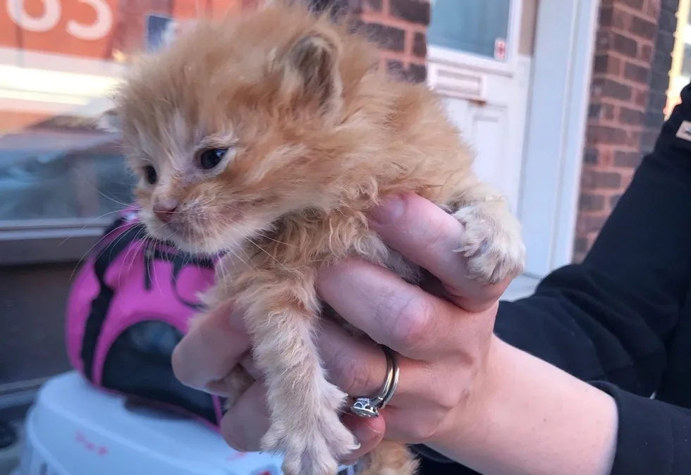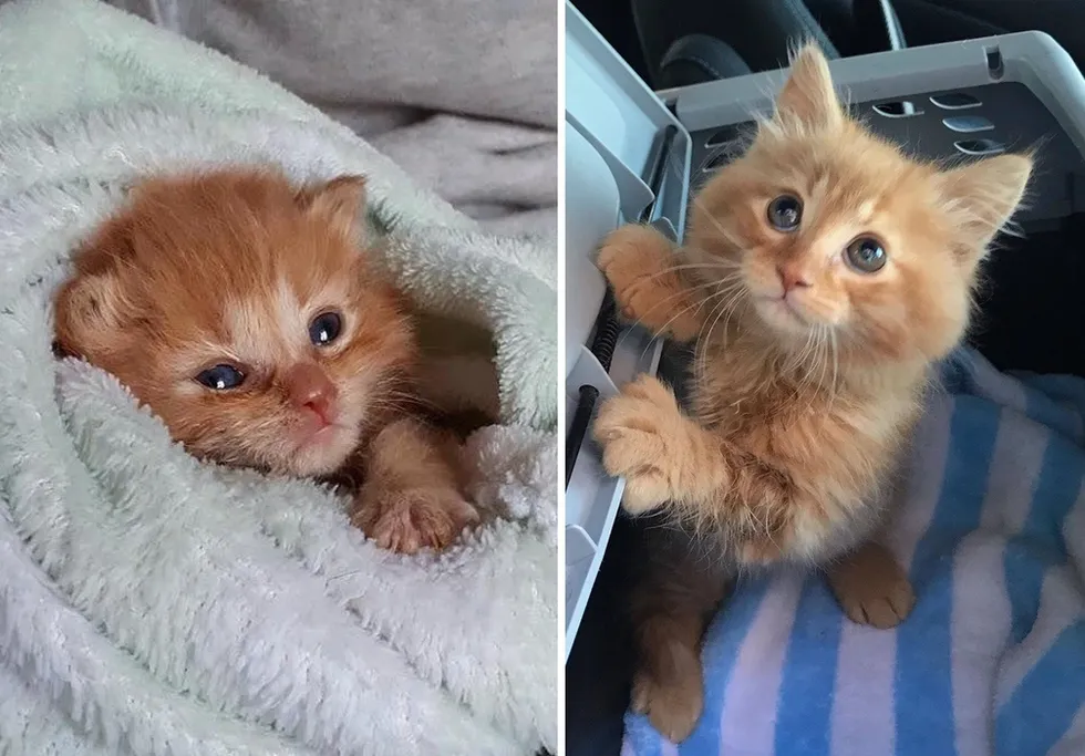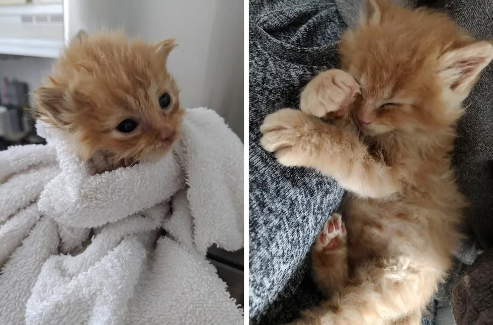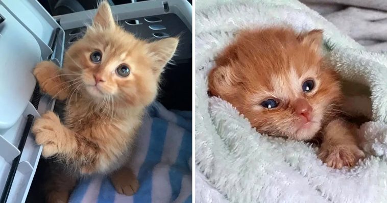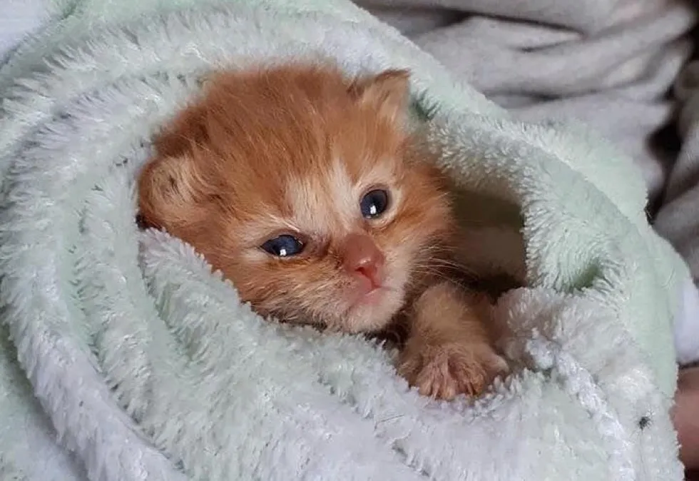 A litter of one-week-old kittens was rescued and brought to a shelter in Montreal, Canada. They required round-the-clock feedings, so a team of volunteers took it upon themselves to care for them. Among the littermates, the ginger kitten was much smaller and struggling to thrive.