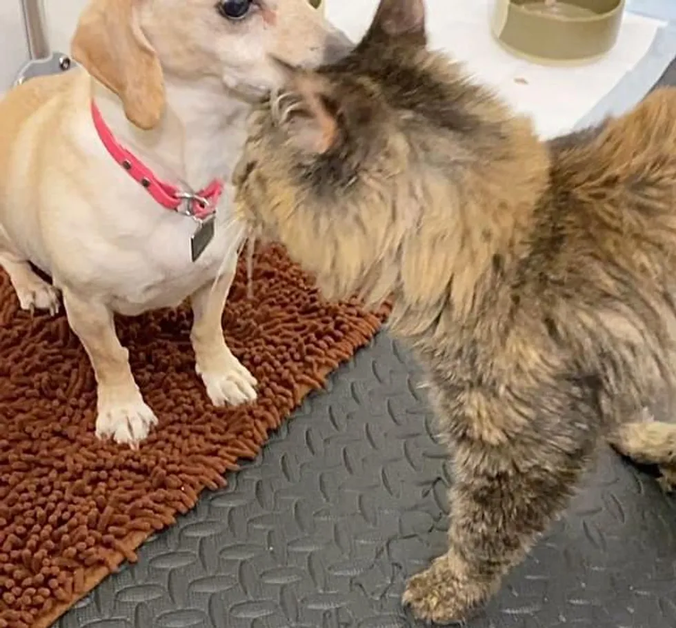 A cat wobbled her way into the hearts of the people that took her in, and made up for lost cuddles with their dog.