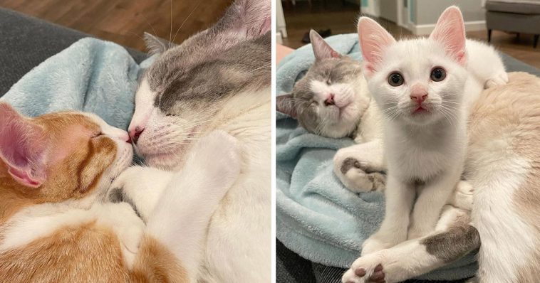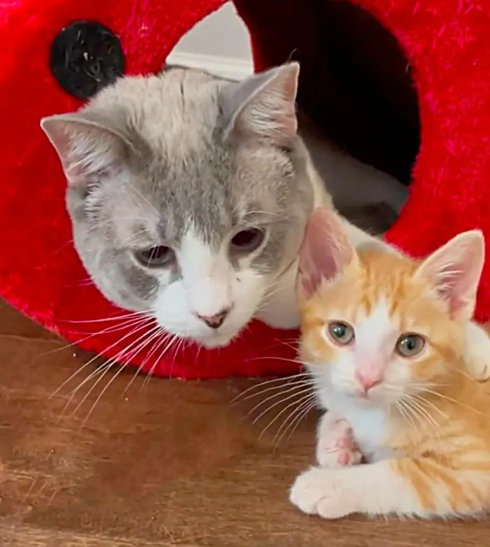 When Oliver met the 7-week-old tabby, Sam, he took her right under his wing. The orange kitten who was in need of some TLC, was thrilled to have Oliver by her side, grooming and comforting her.