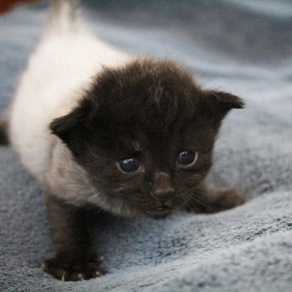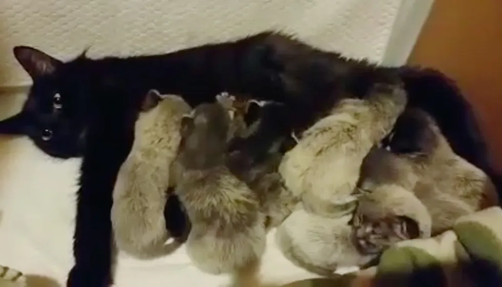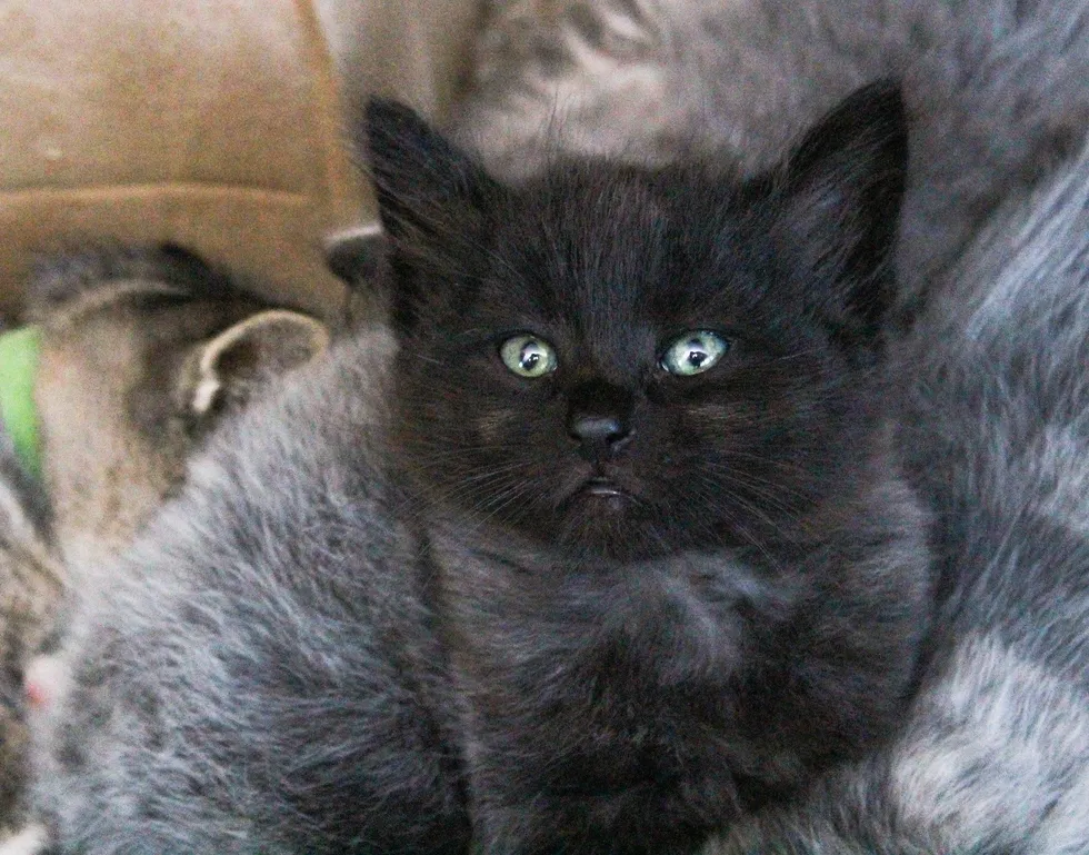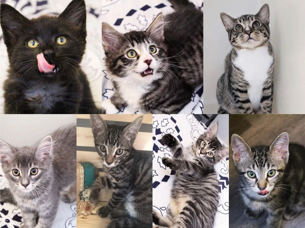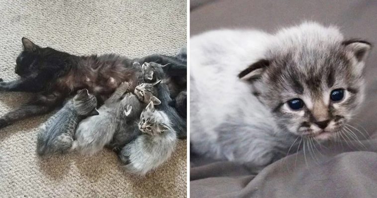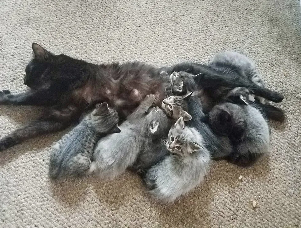 A sweet black cat gave birth to a litter of seven kittens and all of them were wearing a “fever coat”.