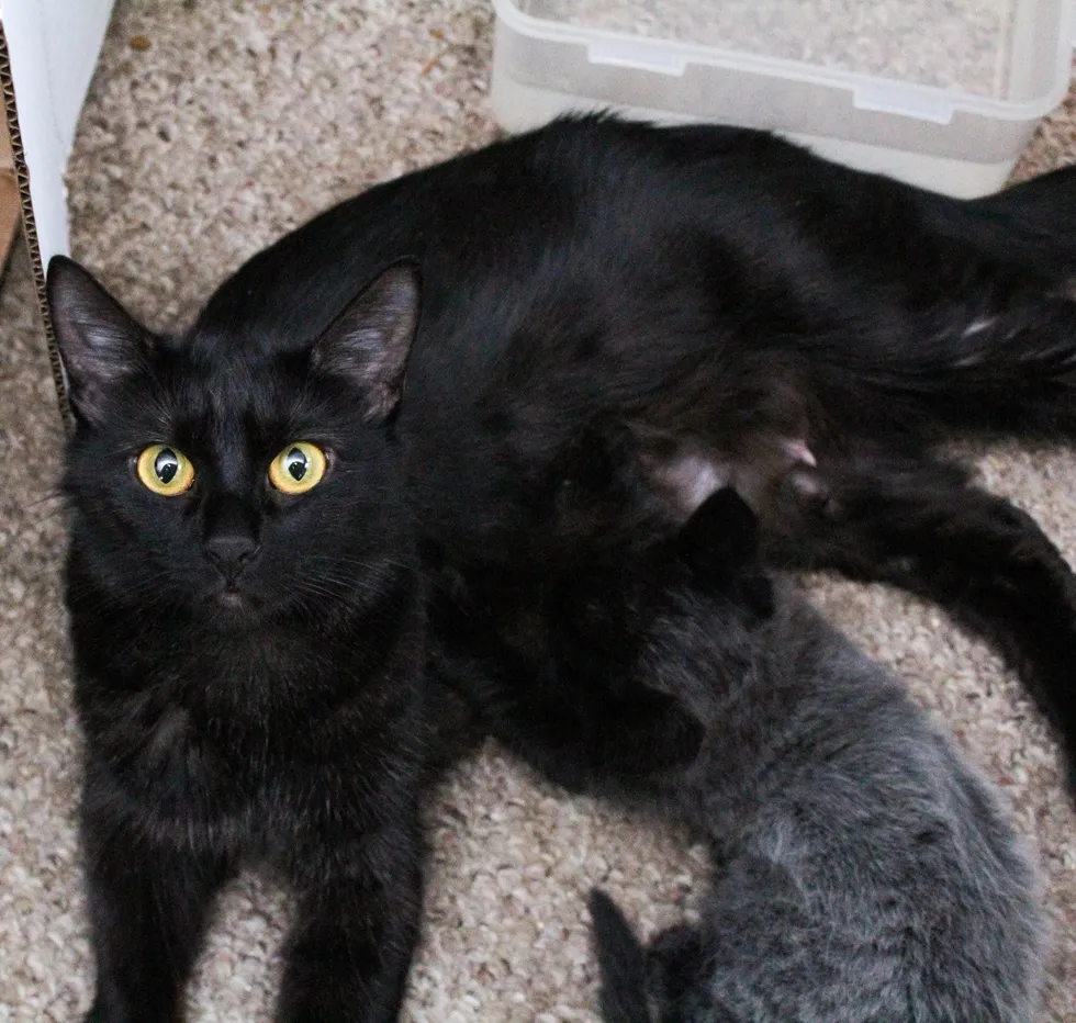 “Mama is amazing! She’s put on a lot of good healthy weight (she was extremely thin from nursing seven kittens!).”