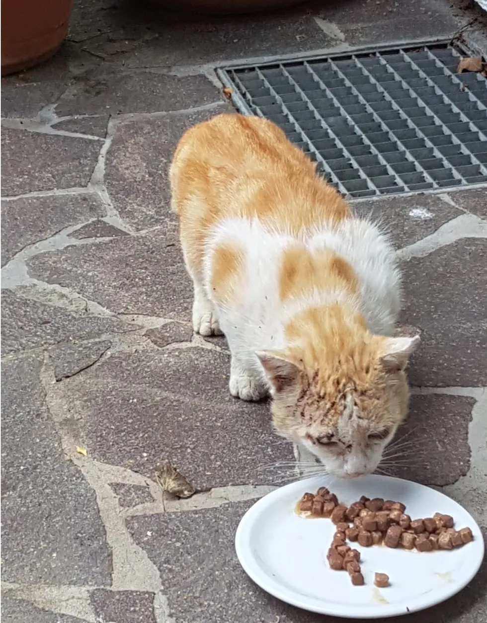 They offered him some cat food but he wouldn’t eat in front of them. The couple walked inside, closed the door, and watched him from afar. “It took about 10 minutes after closing the door until we saw him gulping down the food.”