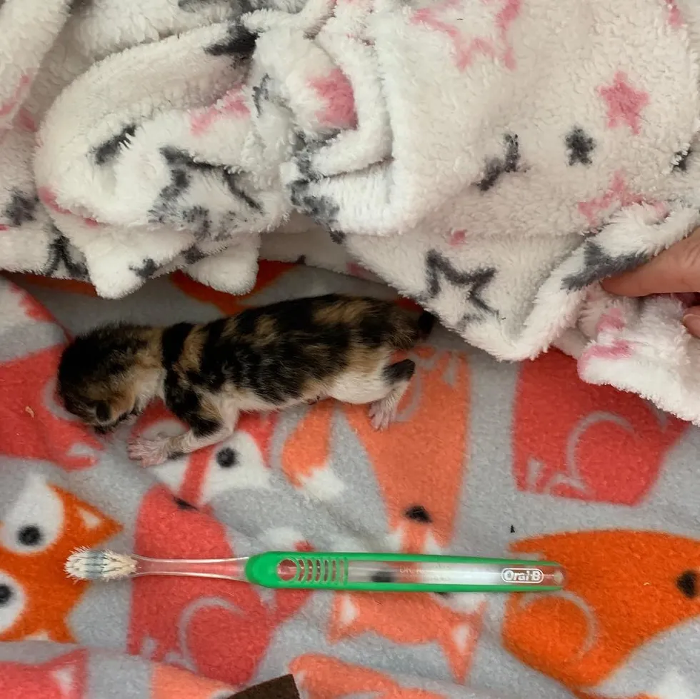They named her Pudding, and she was smaller than a tiny toothbrush. “She loves her food and gobbles it all down. She doubled her weight in a couple of days.”
