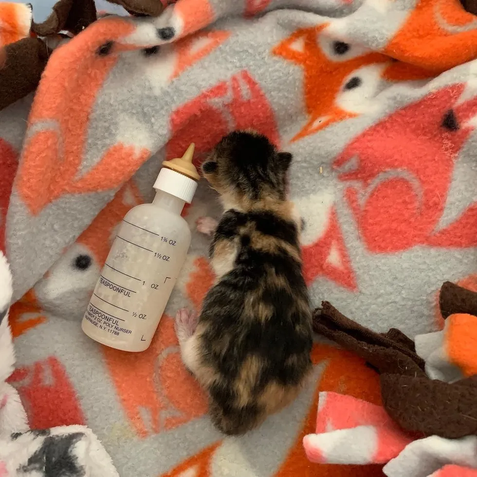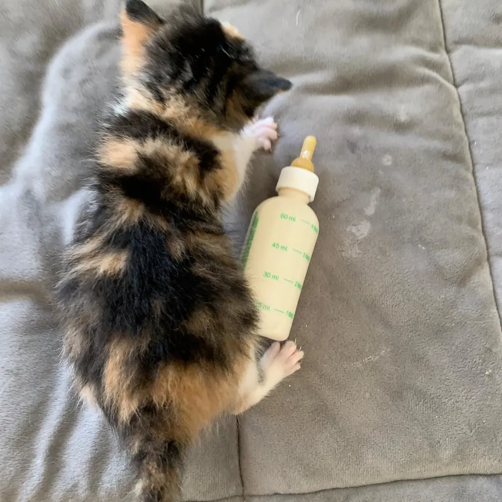 Just a few weeks ago, Pudding was the size of her tiny bottle.