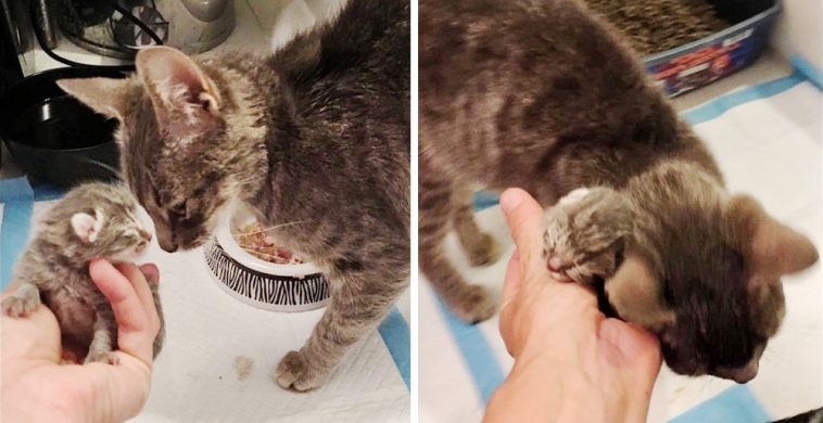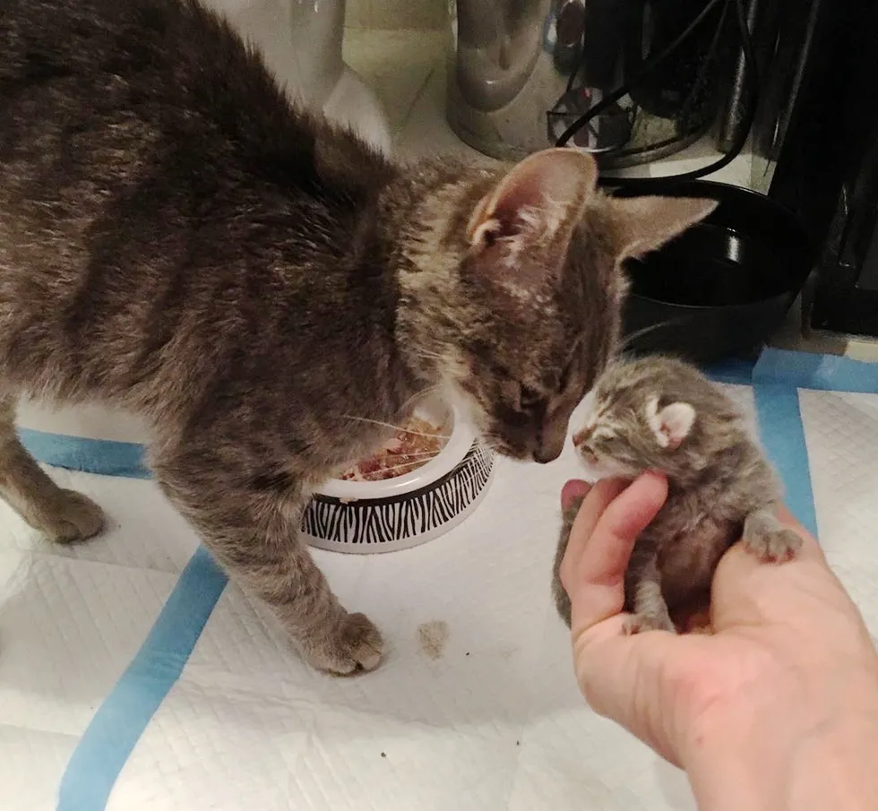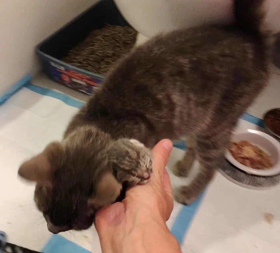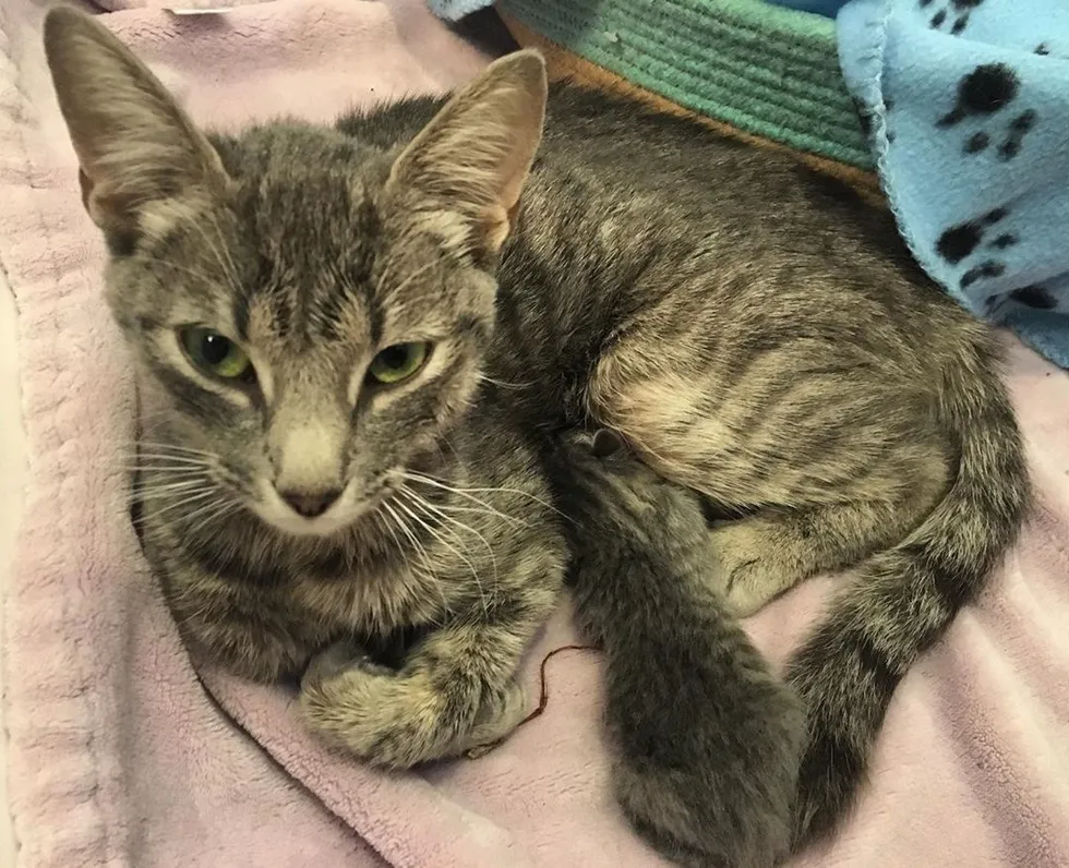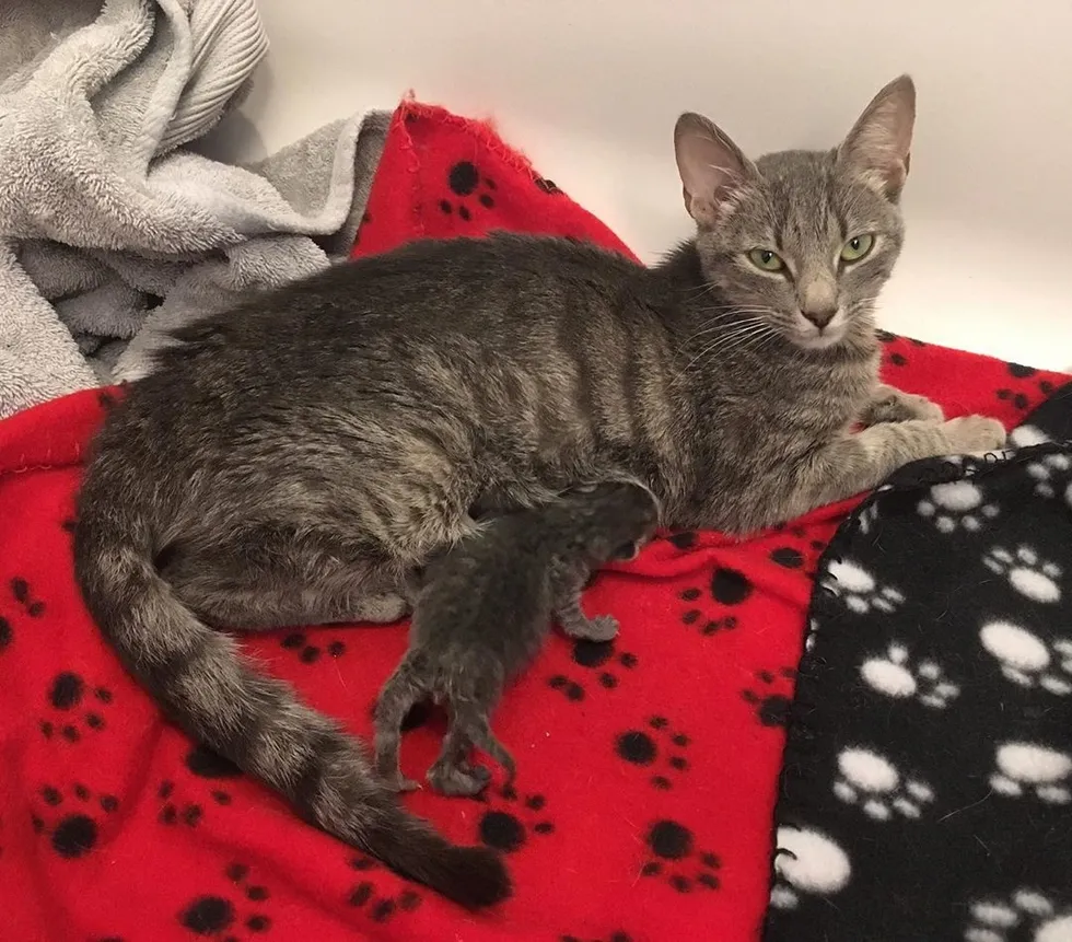 There were complications during labor due to her being so young and just skin and bones. The cat mom, named Shauna, had to have an emergency c-section. Despite their very best efforts, only one baby survived.