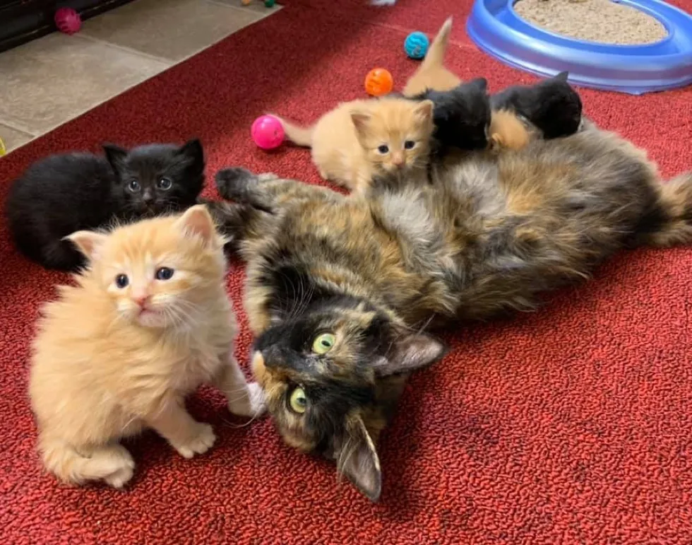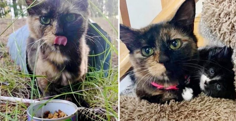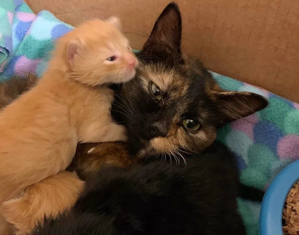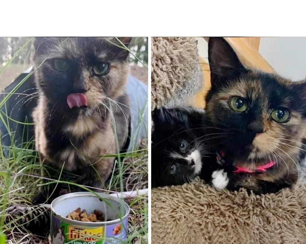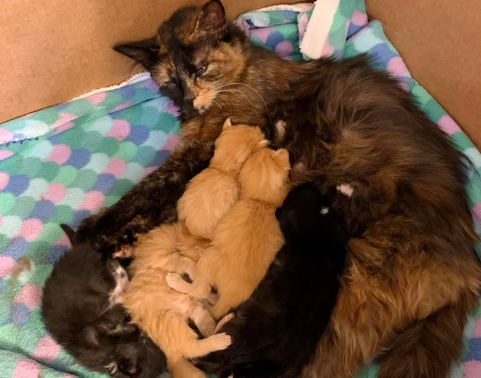 When they first met the sweet tortie, she was on her last leg but hanging in there so her kittens could survive.