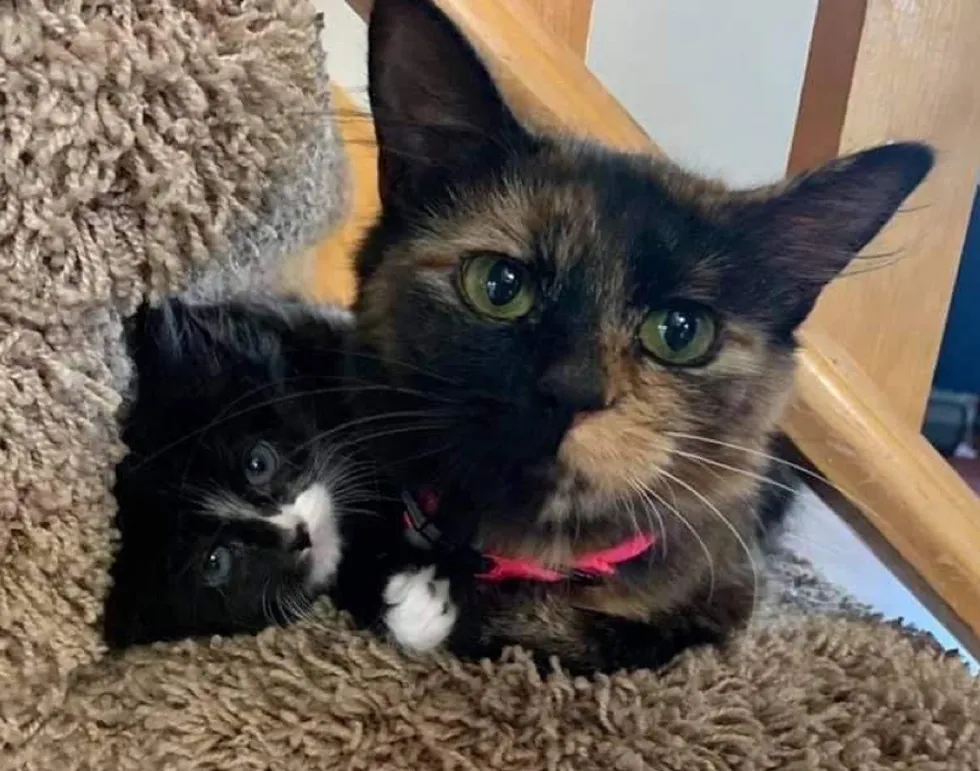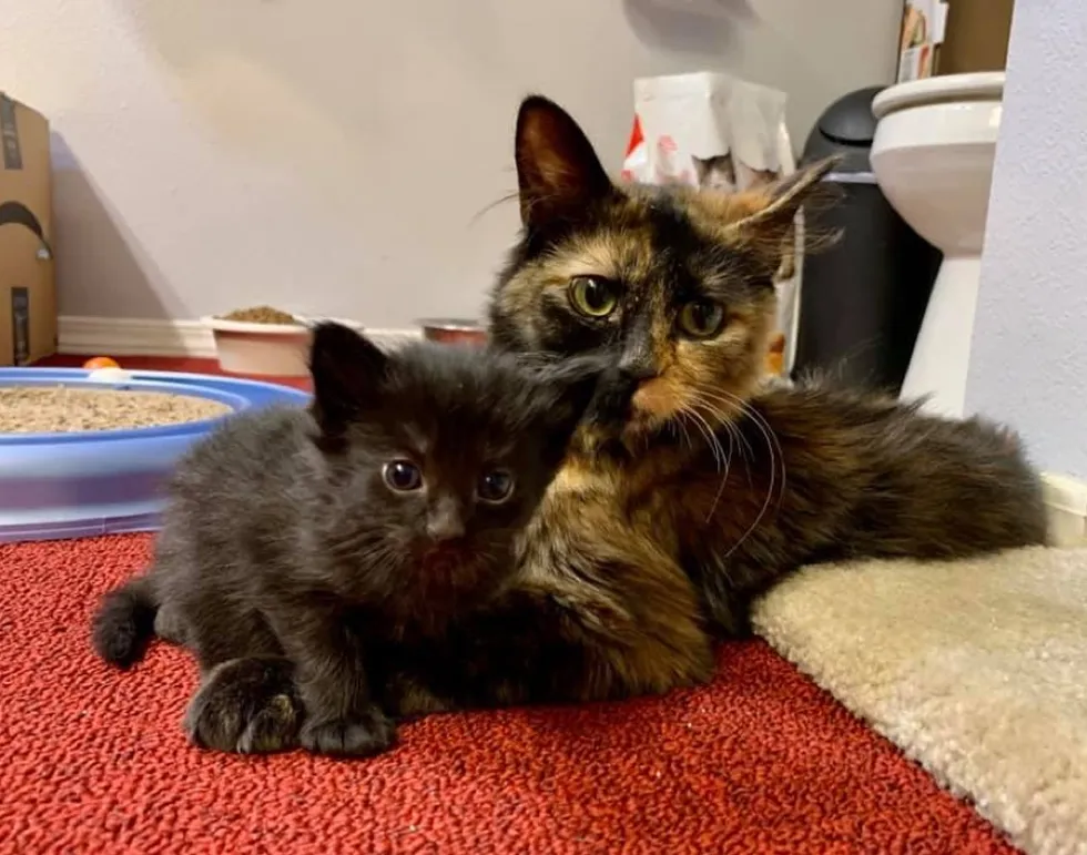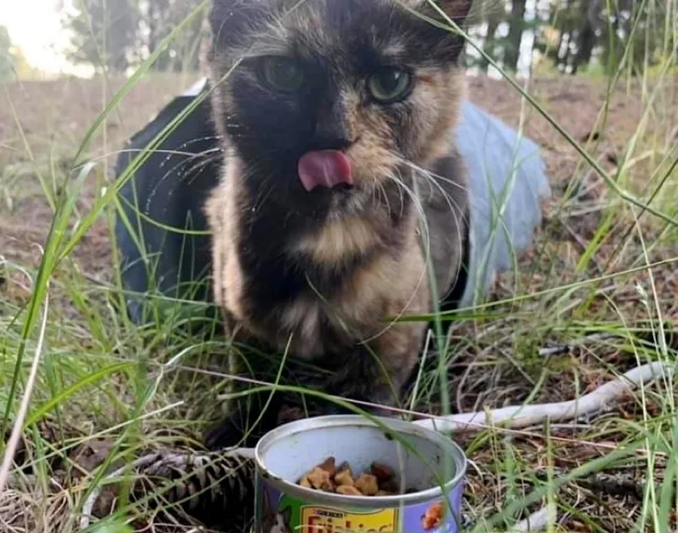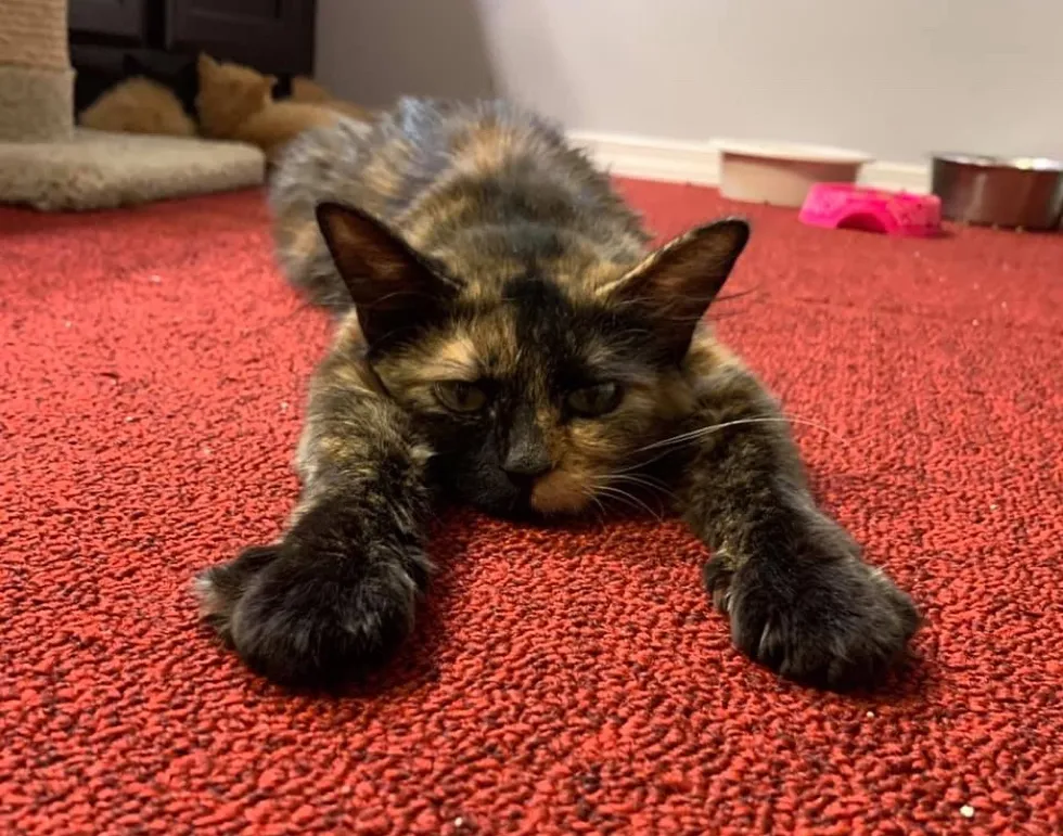 When they first met the sweet tortie, she was on her last leg but hanging in there so her kittens could survive.