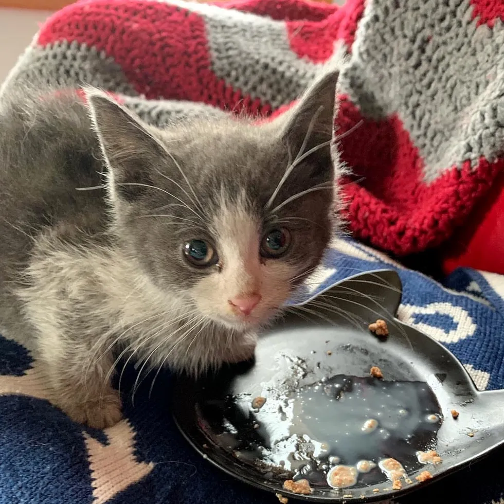 The kitten was starving, wolfing down a dish of food as soon as it was served. After a big meal, they gave him some time to recuperate and get comfortable before giving him a bath.