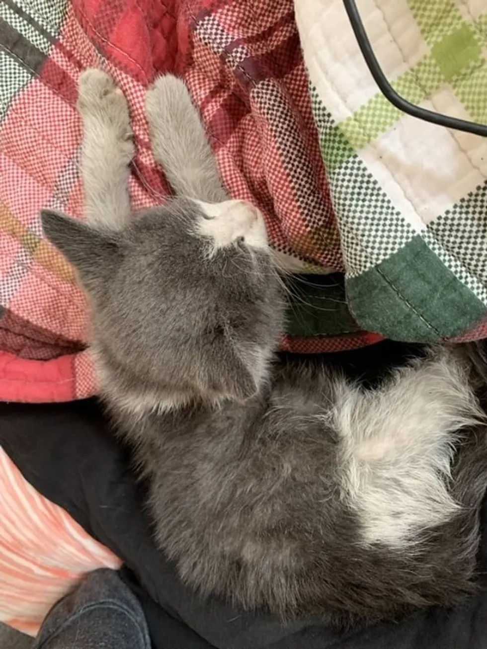 Athina set him down on a warm blanket, and the kitten purred instantly and started rolling around, begging for belly rubs. “We thought he would need socializing (since he was hissing earlier) but then he started rolling over for love and pets,” she said.