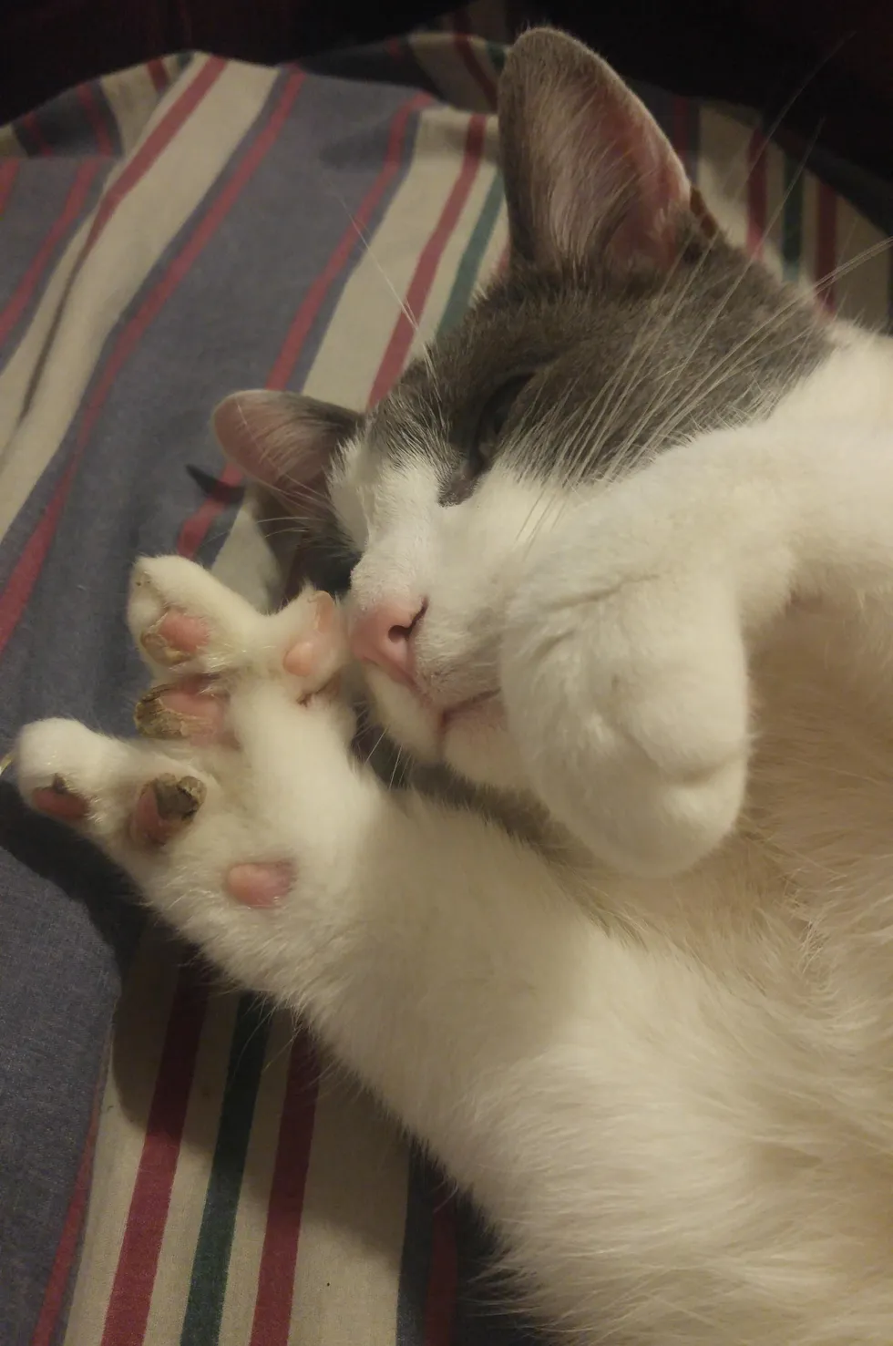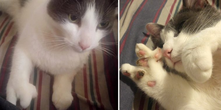 Spock showed up on the couple’s porch a few days ago, scratching at their door, crying for help. They opened the door for the little grey and white cat to come in. It was incredibly cold at -25°C (-13°F) in Eastern Ontario, Canada. The sweet kitty was so glad to be in a warm home.