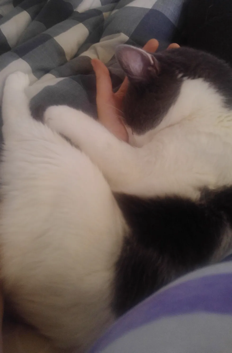 The sweet kitty fell asleep in his human’s hand, snuggling and purring.