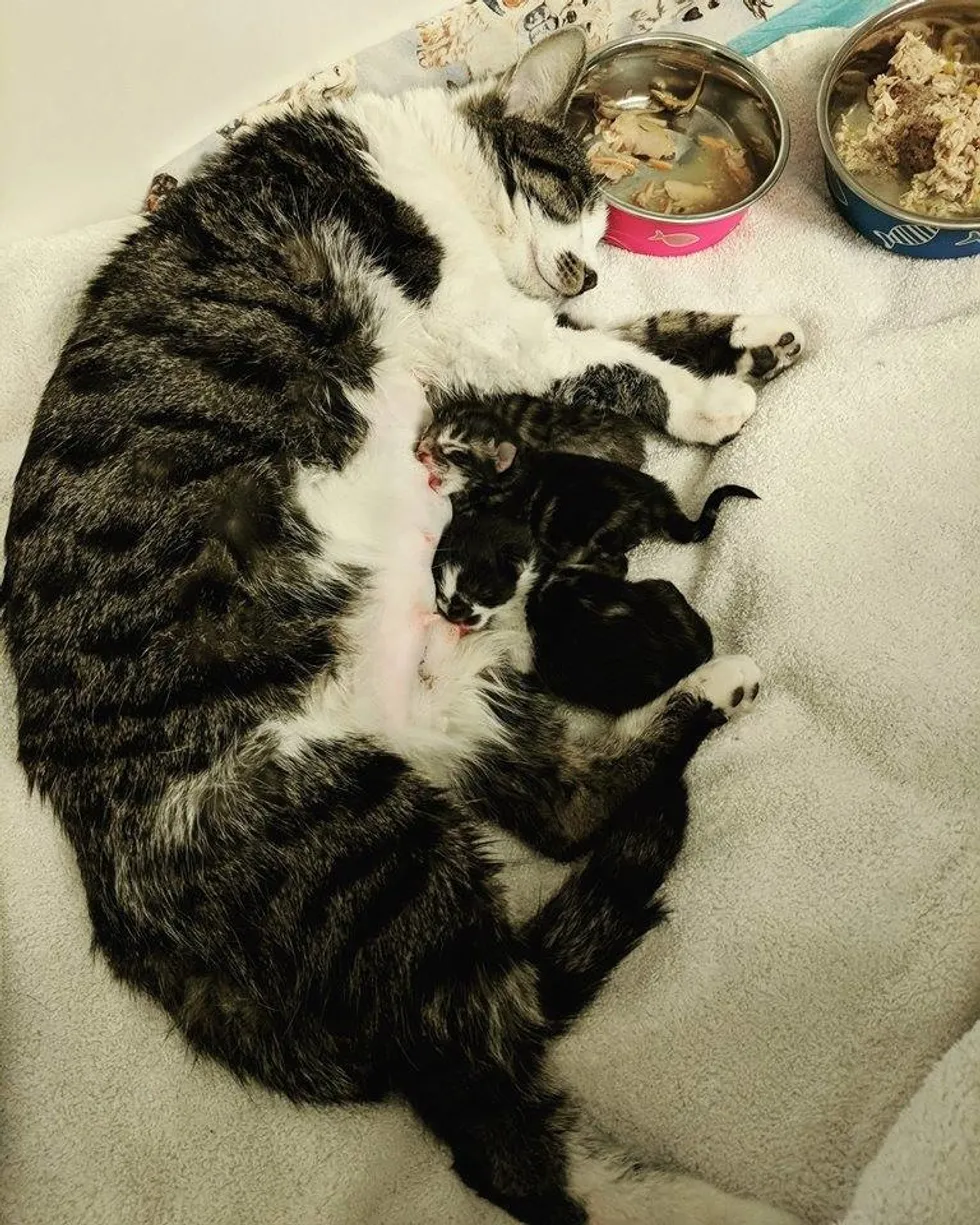As soon as Fennel felt better, she jumped right back to nursing and caring for her kittens.