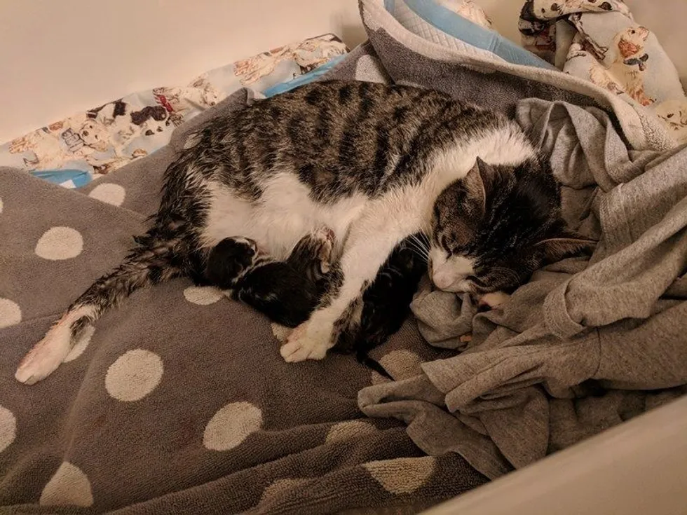 She transferred the feline family of four from the box to the bathtub covered with towels, blankets, and a heating pad, and she stayed with them in the tub until 4:30AM.