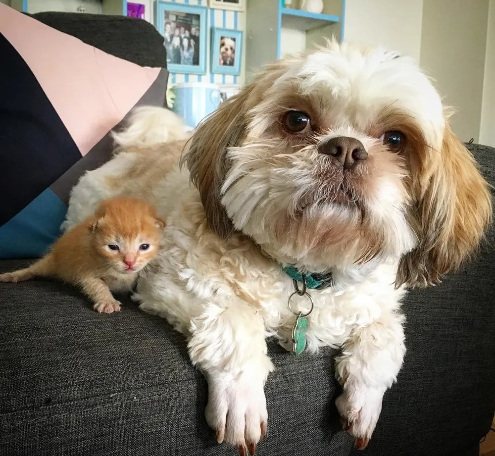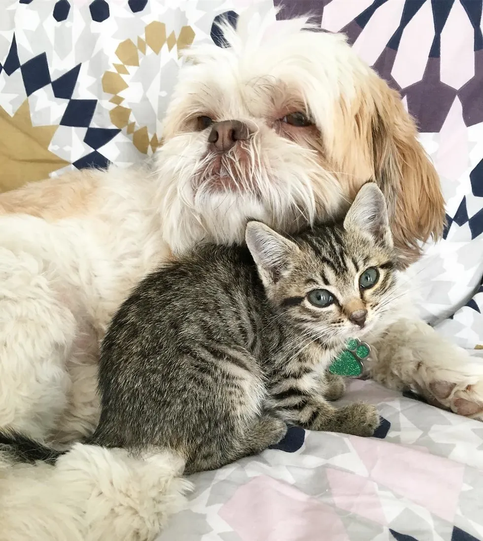 When a wobbly kitten came to their care, Moon was very protective and wouldn’t let her out of eyeshot.