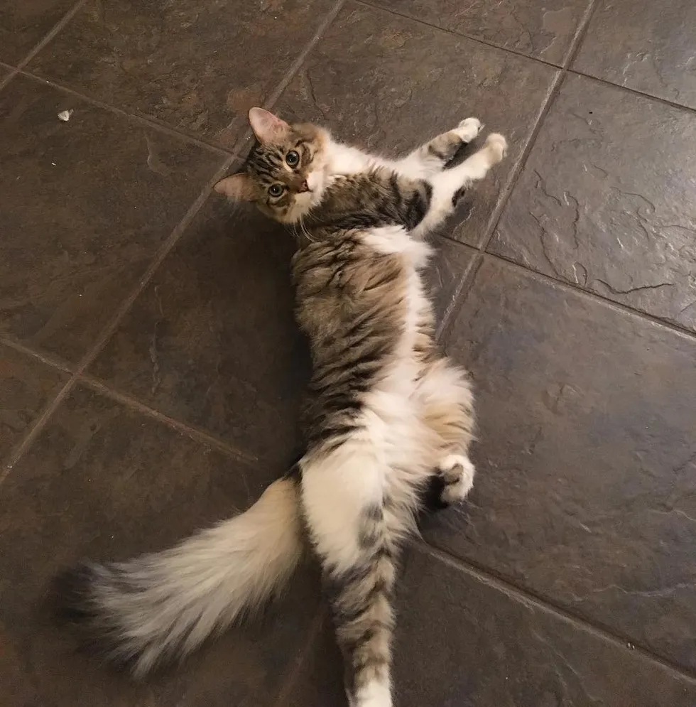 A week ago, sweet Mayday turned one. She’s blossomed into a beautiful cat with a long, fluffy tail to be marveled.