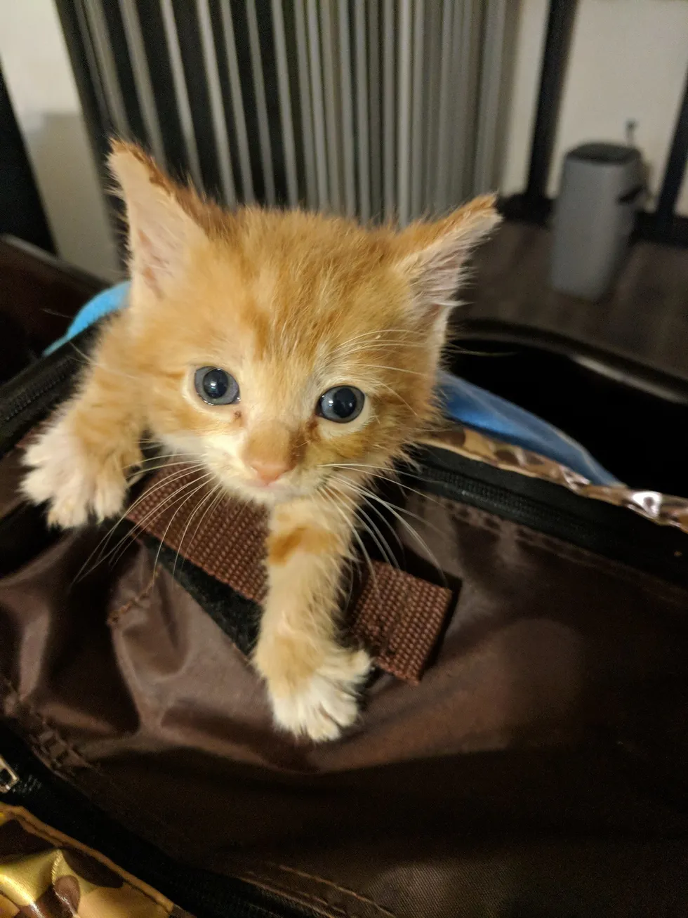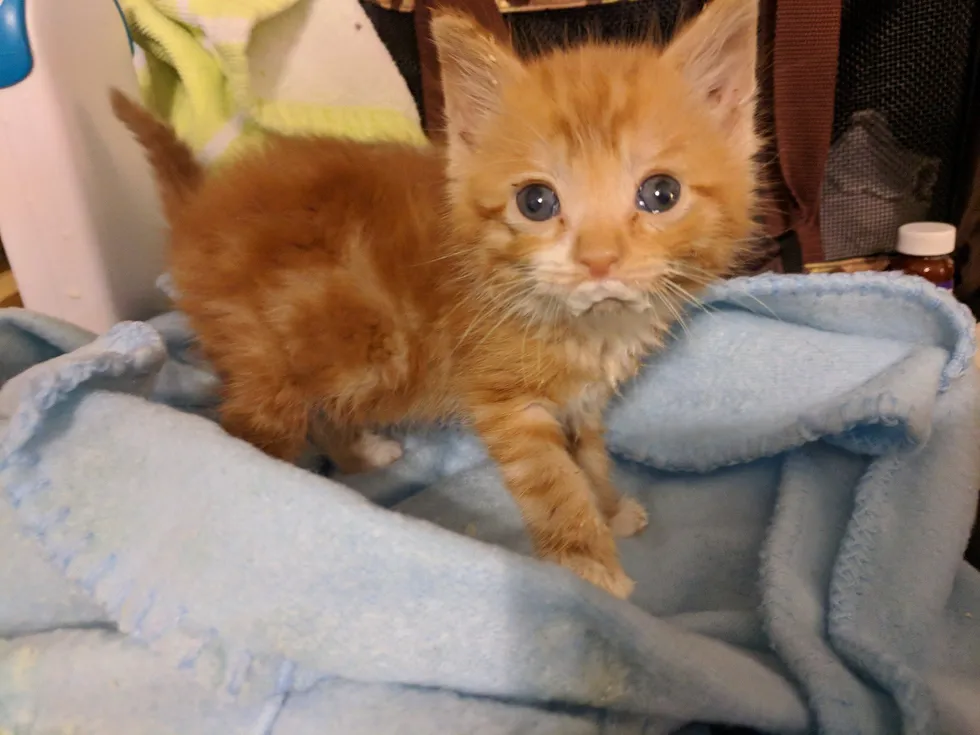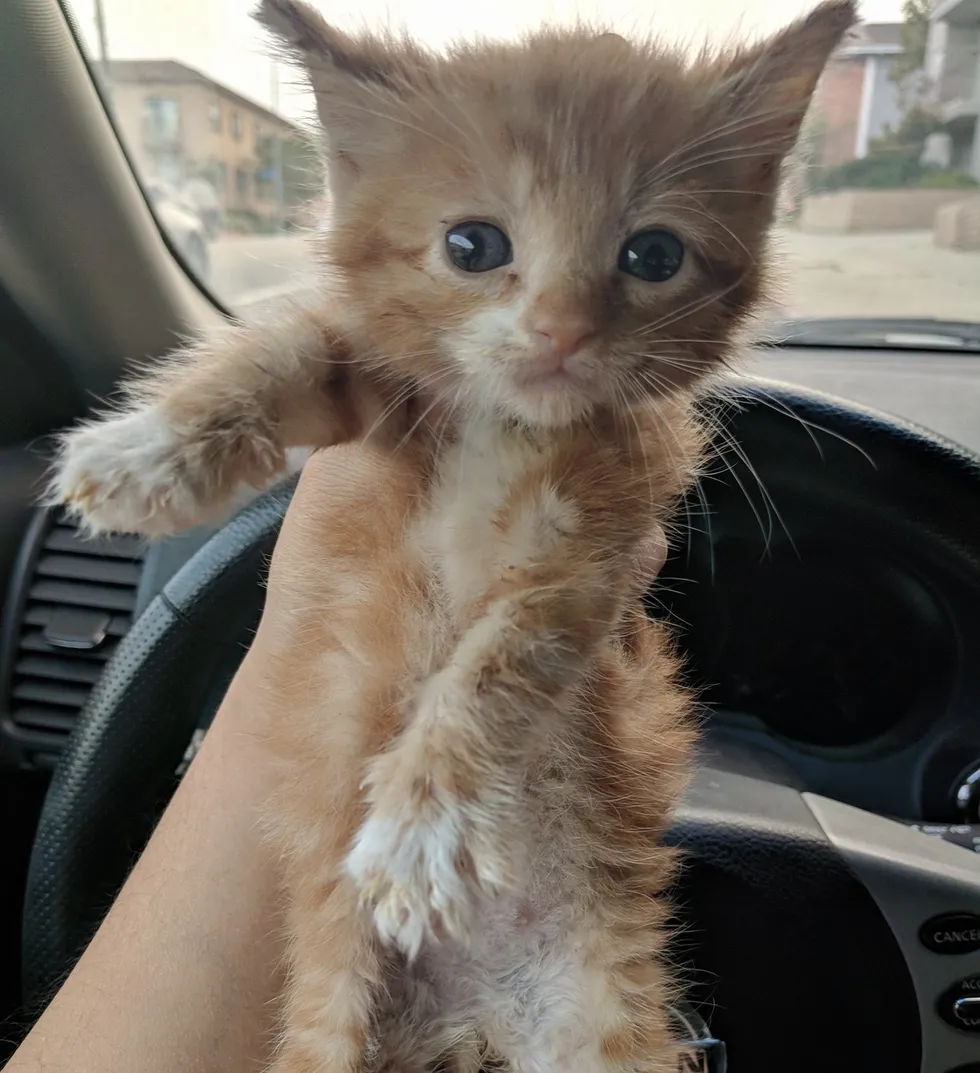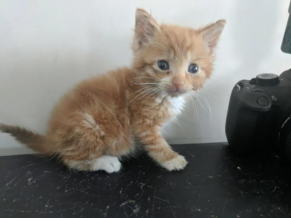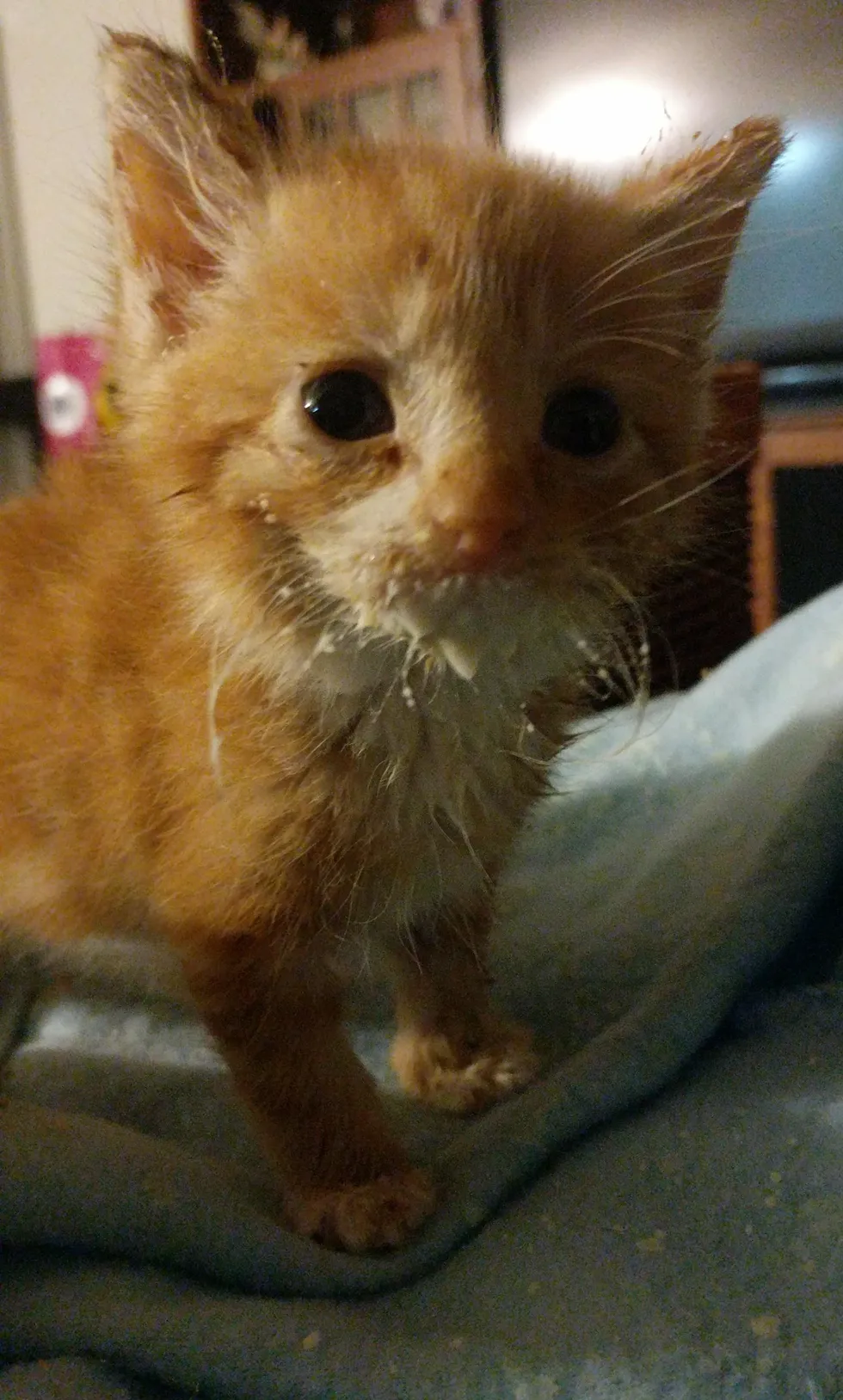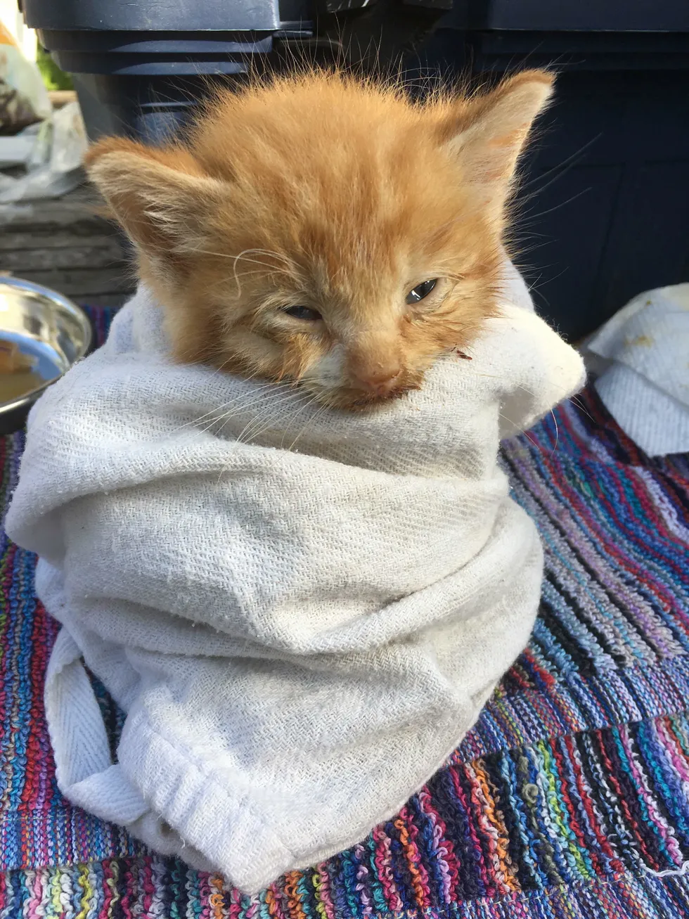 The ginger boy must have fallen from the tree. He was very weak and congested. The lady brought the kittens inside and tried to feed them but little Bennett refused to eat, and soon he started fading.