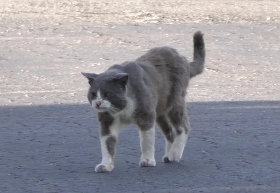 The gray and white cat came back for feedings after he noticed that Chris brought food one day. He was rough around the edges and clearly in need of medical attention.