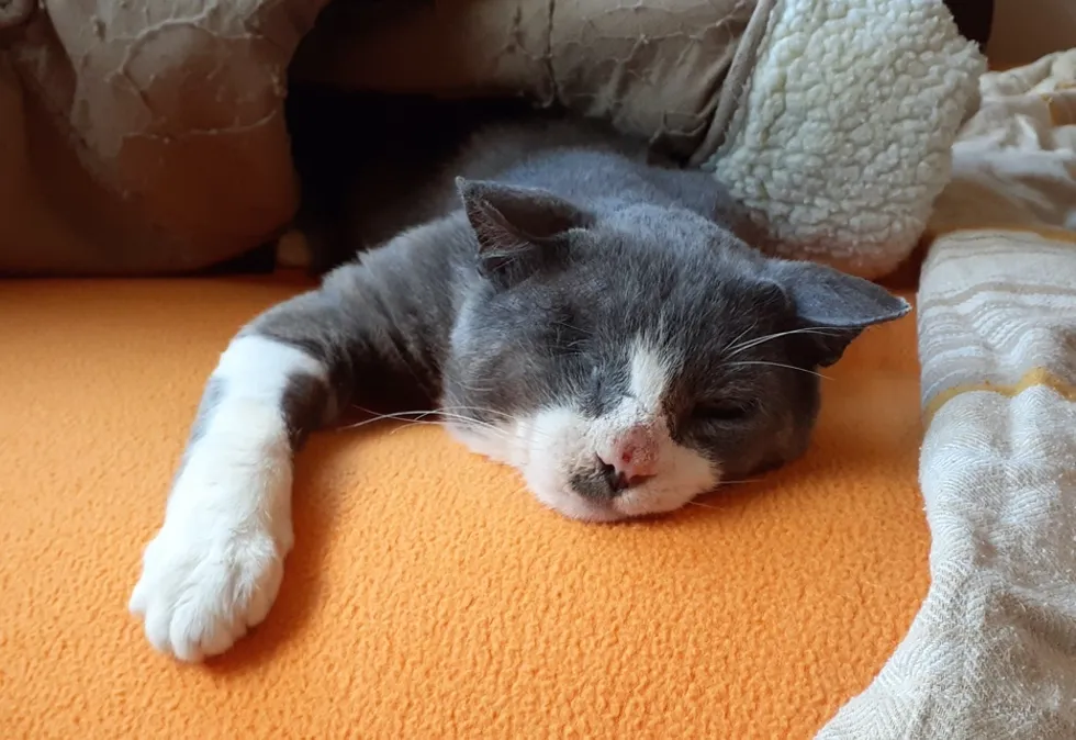 Odin had been living with a lot of pain prior to his rescue. He underwent an eye enucleation surgery, had thorough dental care, and various other procedures to address a host of health issues. The sweet boy bounced back from his surgery like a champ. He kept his purr motor on high, and all he wanted was to be petted and cuddled.
