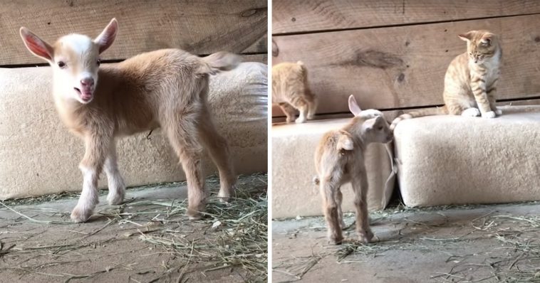 Even though he’s only a couple of days old, Hector – a very sweet Nigerian Dwarf goat – is trying to make himself a name at the farm. But while he’s showing off in style, in front of his kitten neighbors, the tiny cats couldn’t help, but rather ignore him. With that unapproachable look on their faces, the kittens are comfortably sitting on ‘a wood shavings bale,’ when Hector decides to join them. As they didn’t seem to stop him from his tries, they all run away soon as the tiny goat manages to climb over there, because he now invades their very precious space. But that’s nothing new for us, because cats are always cats, right?!