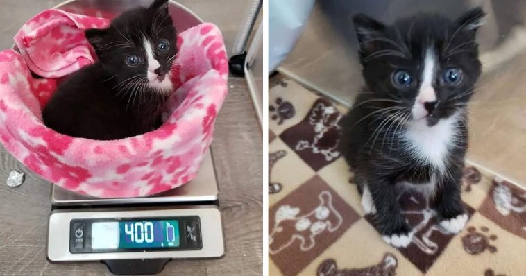 Kittens are pretty adventurous when they open their eyes, and they can wander off in many directions. A few months ago, a volunteer named Erin from Wrenn Rescues in LA received a call about a kitten who had quite the adventure. The black and white cutie was exhausted and covered in slime and dirt after being found stuck in a drain.