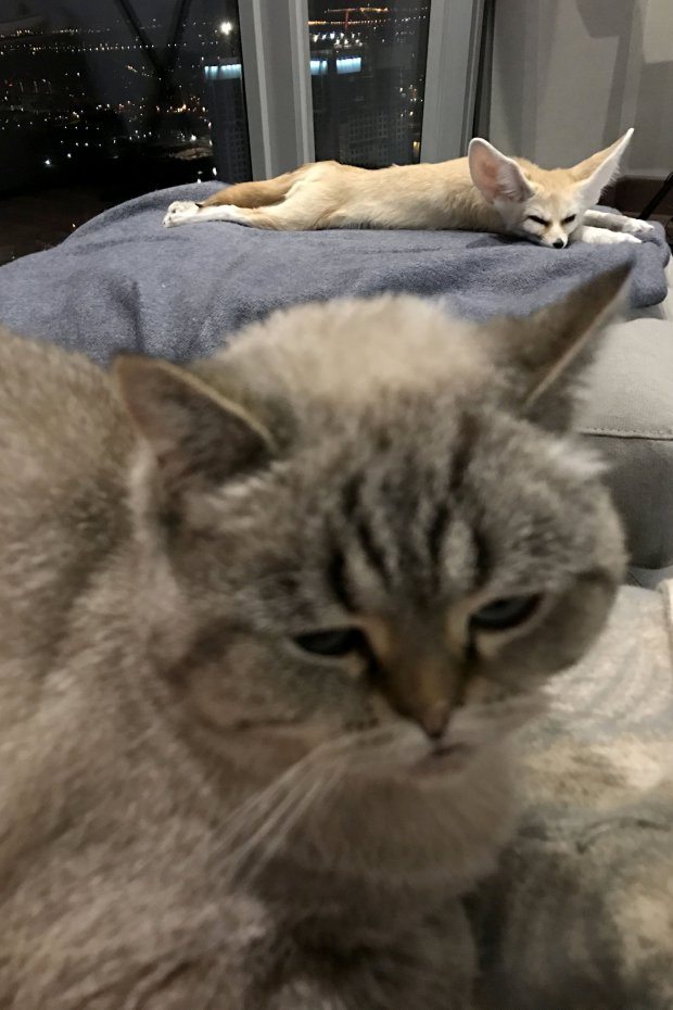 Just like all roommates, the cat and fox can get on each other’s nerves. Kuzma loves chasing Zima around the house, but Zima gets her revenge by loving to sleep on Kuzma’s head.