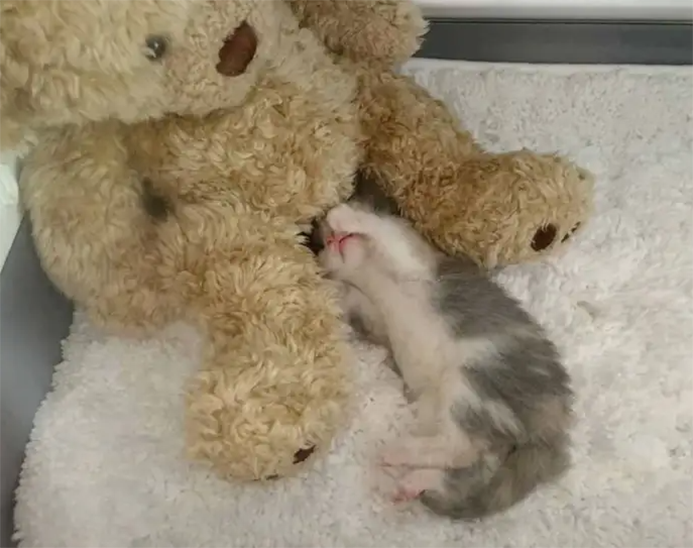 Julia can’t control her body temperature as a newborn, so she needs to sleep and slumber in a warm incubator in between feedings. Sarah put a teddy bear in there to keep the cat company.