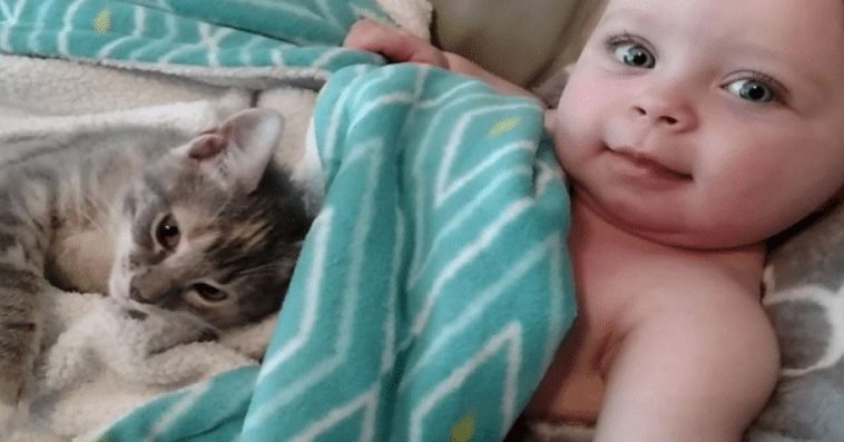 My 8 month old daughter and her new kitten, Eevee fell asleep together. This is them waking up. Yea, its the cutest ever,” said Jenny.