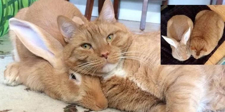 These two buddies not only share an inseparable bond, they could pass for twins! Meet Gus, the ginger cat and his best friend in the word, Wallace, a Flemish Giant rabbit.
