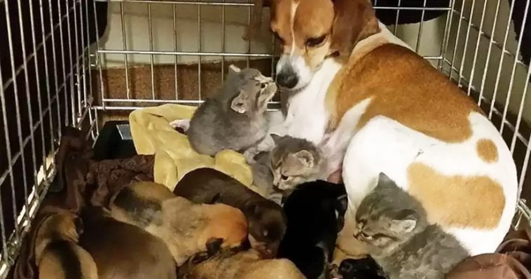 This lovely Beagle is taking care of 3 abandoned kittens as if they were her own! And, the best part is that this momma has 7 puppies herself!