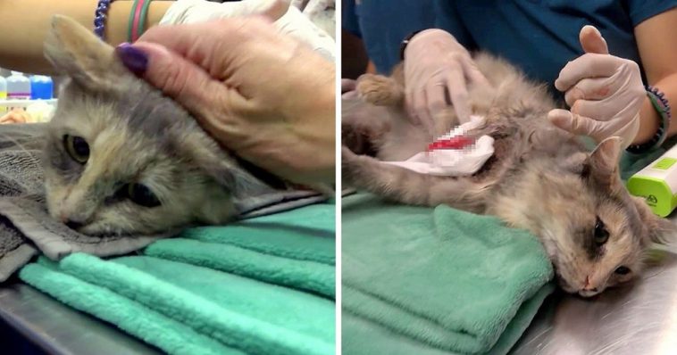 The woman placed a distress call with the rescuers of “Hope For Paws”. In the meantime, she began taking care of the tormented creature, who was helplessly trying to deal with her excruciating pain. By the time the rescuers responded, the cat’s condition had deteriorated badly and she barely had any strength to move on her own.