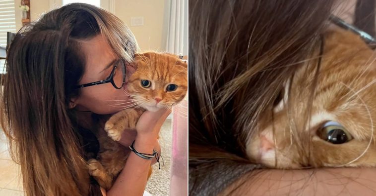 The cat can be seen curled up on her owner’s shoulder, scared to death of the trimming. He always snuggles with his momma whenever there’s grooming to be done. He’s not aggressive or anything, but his reaction is priceless.