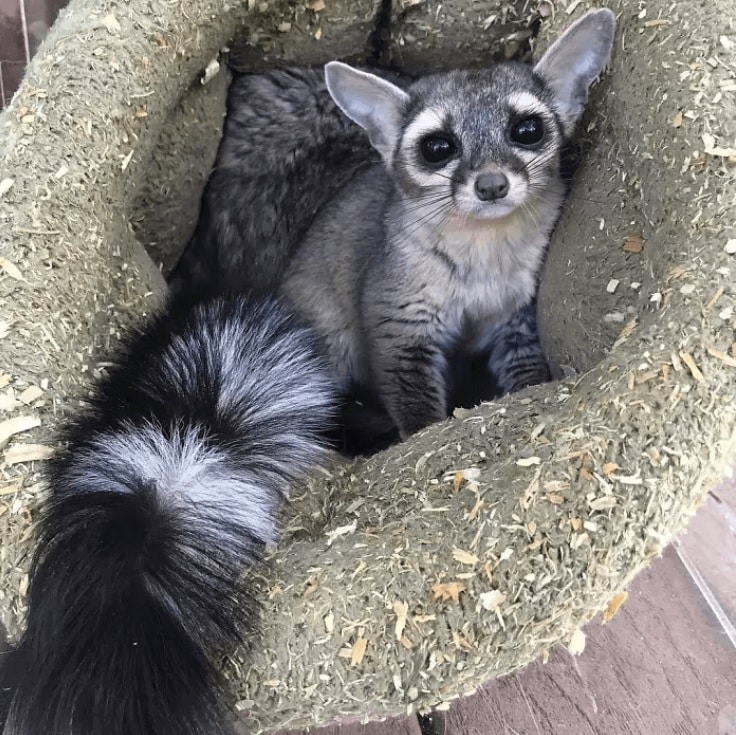While the odor may be foul, the cat itself is very cute. The mid-sized cat resembles a mix of a racoon and fox. It has large ears similar to a fox and a bushy tail. If you’re wondering why it’s called ringtail, it’s because of those black rings on the tail fur.