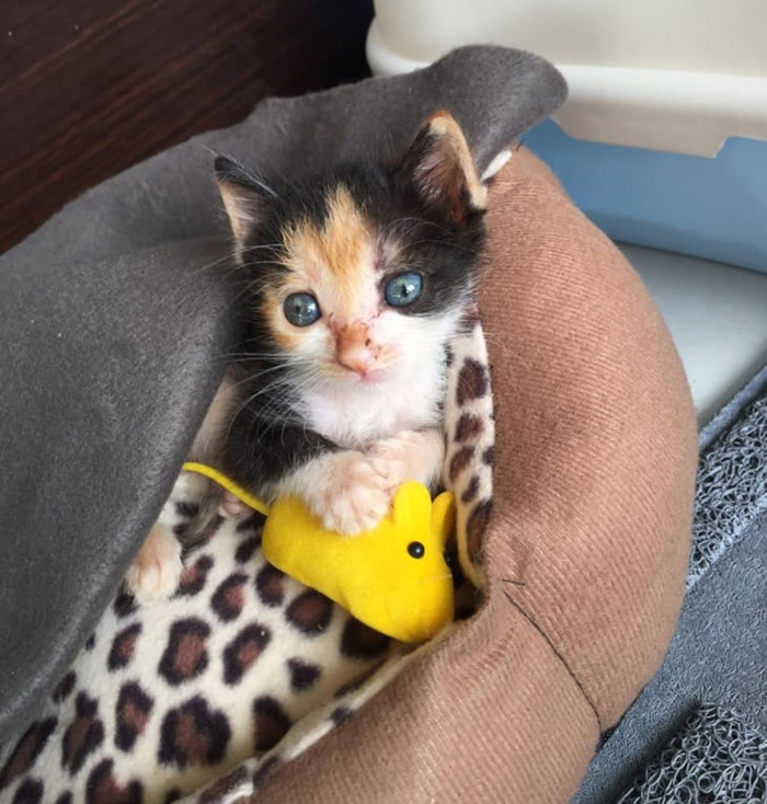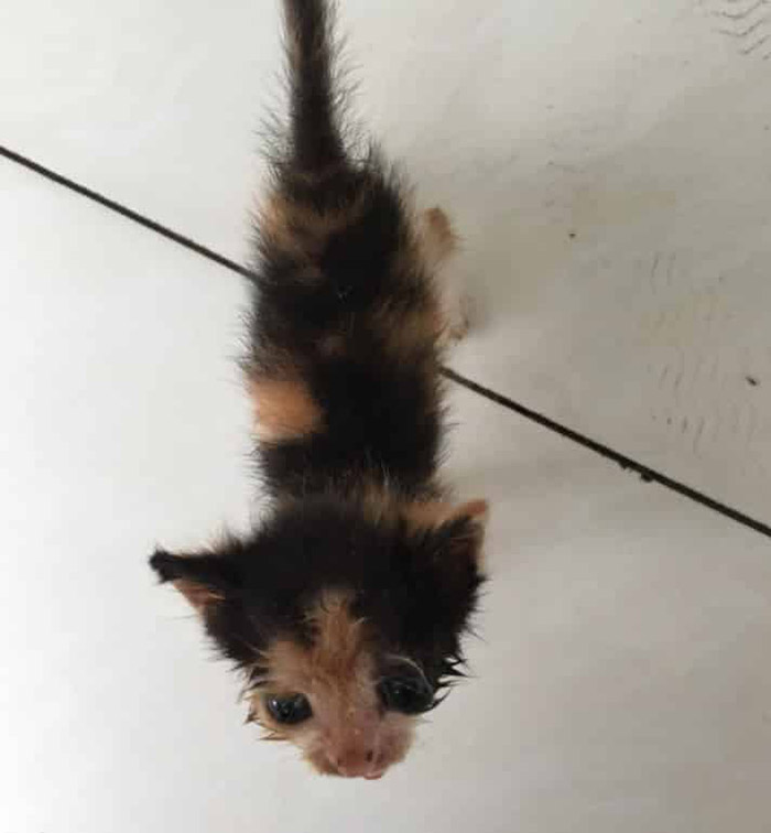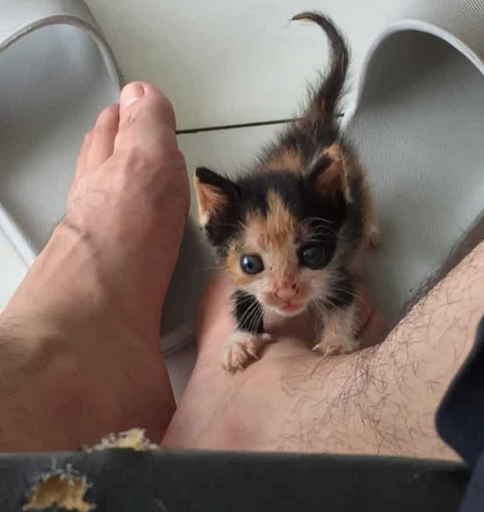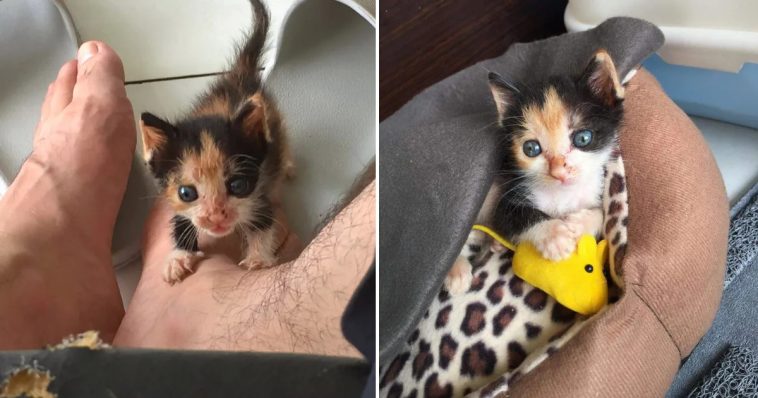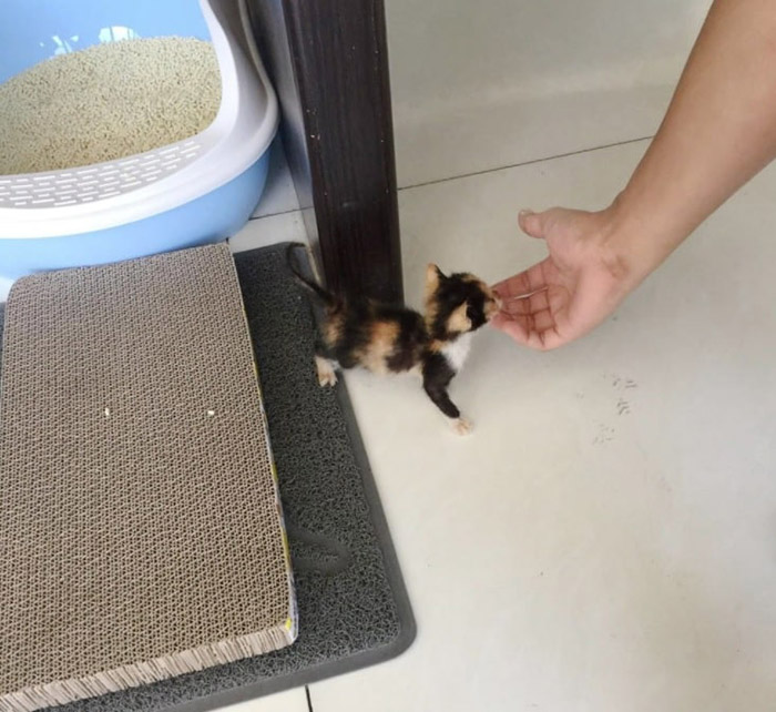 This tiny kitten is called Sansa, and just like many others, it was rejected by his mom. A scrawny kitten left outside to die, she was picked up by a kind-hearted man. She was literally skin-and-bones when he found her, so the first thing the man did was to give the tiny kitten a lot of food.