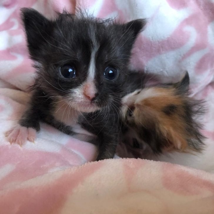 Both kittens were riddled with bugs and literally fought to stay alive. Melinda Blain, a cat rescuer, took them and made sure they lived. In the beginning, things weren’t that rosy. They were skinny with their ribs literally protruding from the skin. One of the kittens, Tuxie Boy, suffered from tiny cracks in its lung, and Melinga wasn’t sure the poor thing would survive.