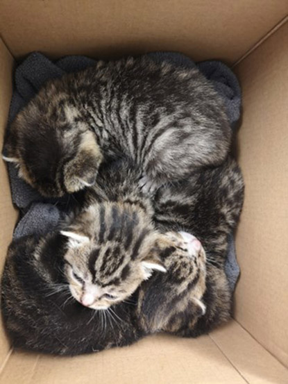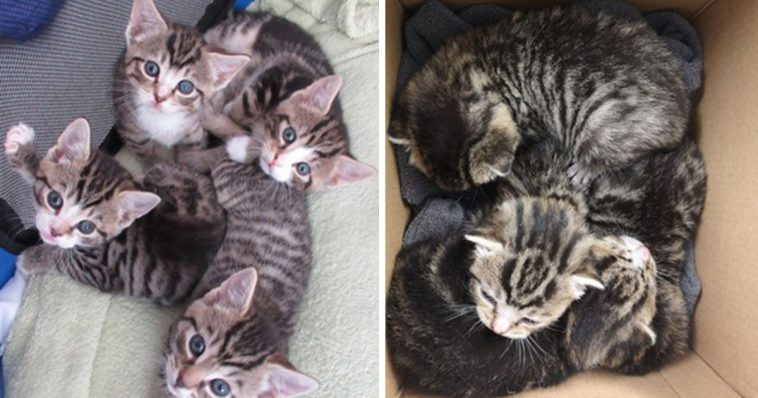 Four tiny kittens were bundled into a cardboard box and saved from almost certain death after their nursing mother was killed on the road.