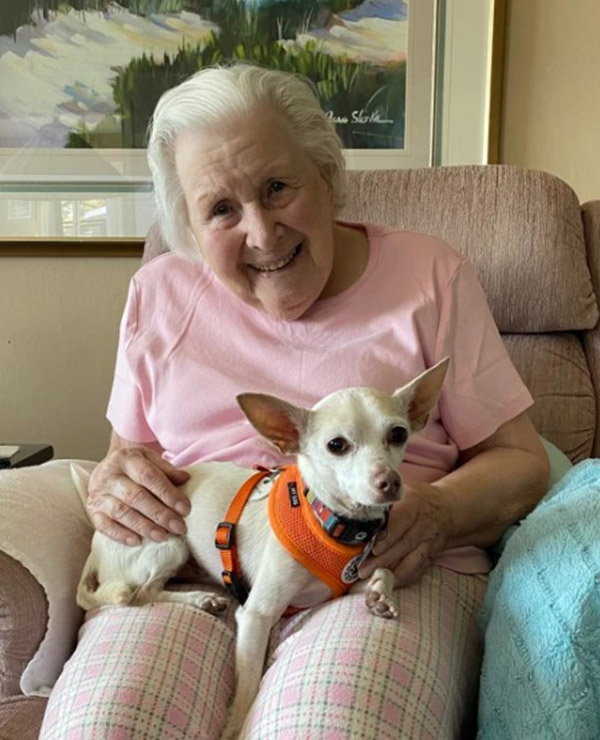 “She is always so pleased to see us and does a funny little walk on the spot with her back legs, wiggling her tail and chirping.