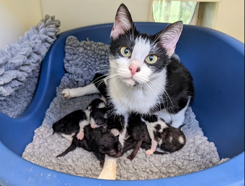 Heavily pregnant Dodge arrived at our Bridgend Adoption Centre in July after a kind member of the public spotted her on the streets.
