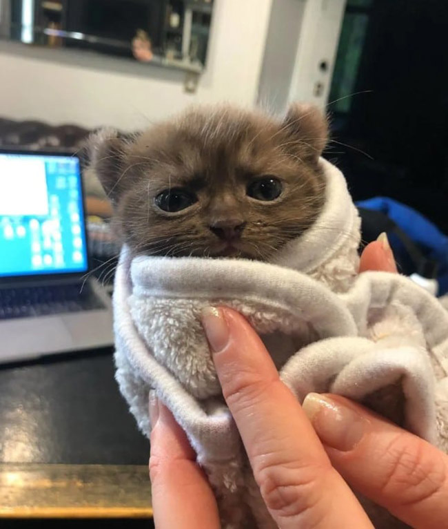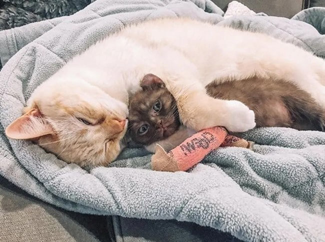 The poor baby was taken in by a resident cat – Pumpkin. She accepted her as one of her own, showing the tiny kitten with love. A few weeks after the therapies, Baby Quill fell ill with FIP. To everyone’s surprise, the kitten responded well to an experimental therapy, and has been fighting the infection like a lion.