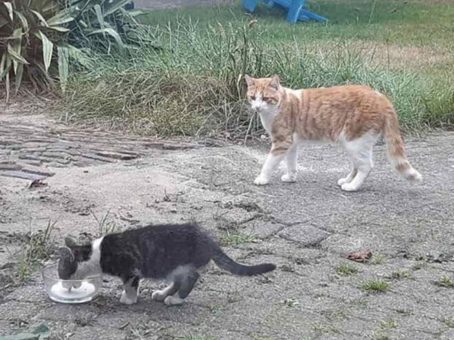 Then, a strange thing happened. One day, Klarieke noticed that Stavros wasn’t eating his food. He was looking outside and she noticed that the cat gave his food to the kitten. Stavros knew what it was like to be hungry, so he didn’t mind sharing his food.