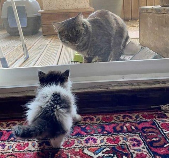 When they first met, the resident (Titak) was a bit surprised. Out of nowhere, there was a tiny kitty in her home conquering territory. She instantly faced her, but the little lady wasn’t thrilled. She showed her fangs and hissed, puffing herself up in front of the bigger cat. Titak was calm and collected, watching the act from afar.