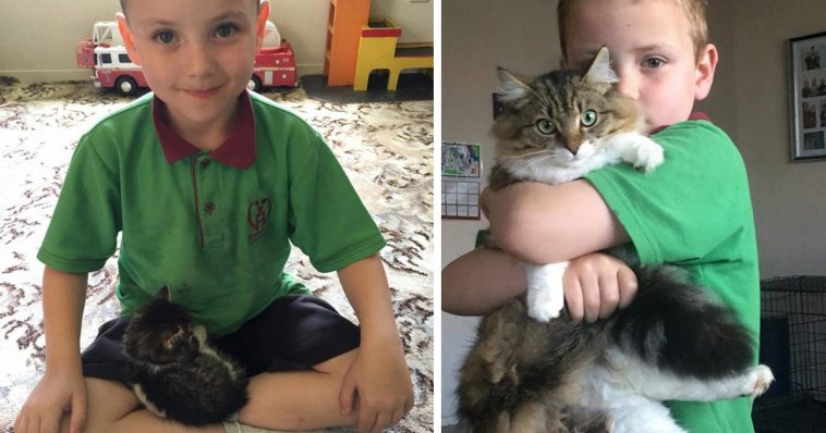 This tiny 3-week old foster kitten walked up to a 7-year old boy and took the role of being his guardian angel.