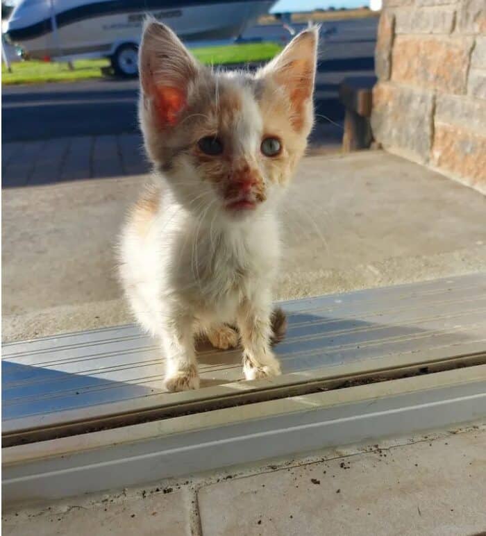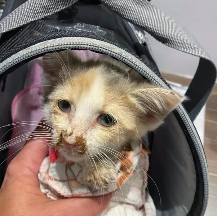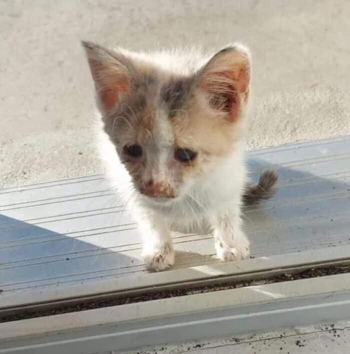 The kitten was pretty malnourished, but it was content that it was safe. It was obviously in rough shape, so it must have been a big fighter. The volunteers named her Moxxie and rushed her straight to the shelter’s vet. Moxie was estimated to be around two months old. She had an upper respiratory infection and needed food immediately, but was otherwise in solid shape.