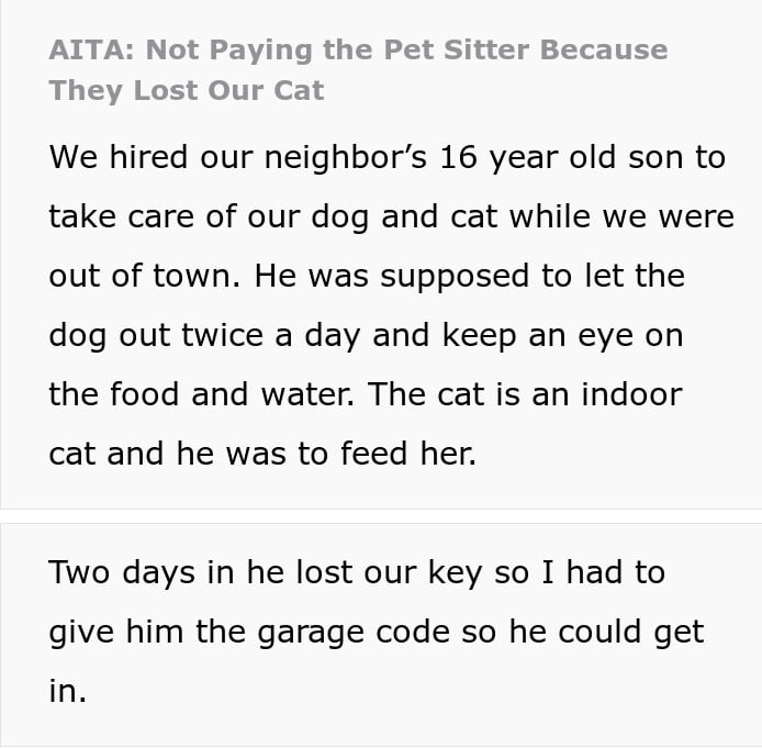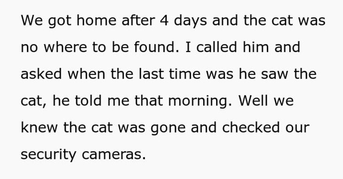 After checking the security cameras, the pet owner determined she was probably gone for over a day and a half. The boy lied that he saw the cat in the morning, and then he said that he’ll find her. There was a nearby spot where coyotes started popping up, so the owners were rightfully afraid the cat would be eaten. It came back after a few days, but the owners decided to refuse pay to the boy. His mom was livid, but the Reddit post received a lot of positive comment.